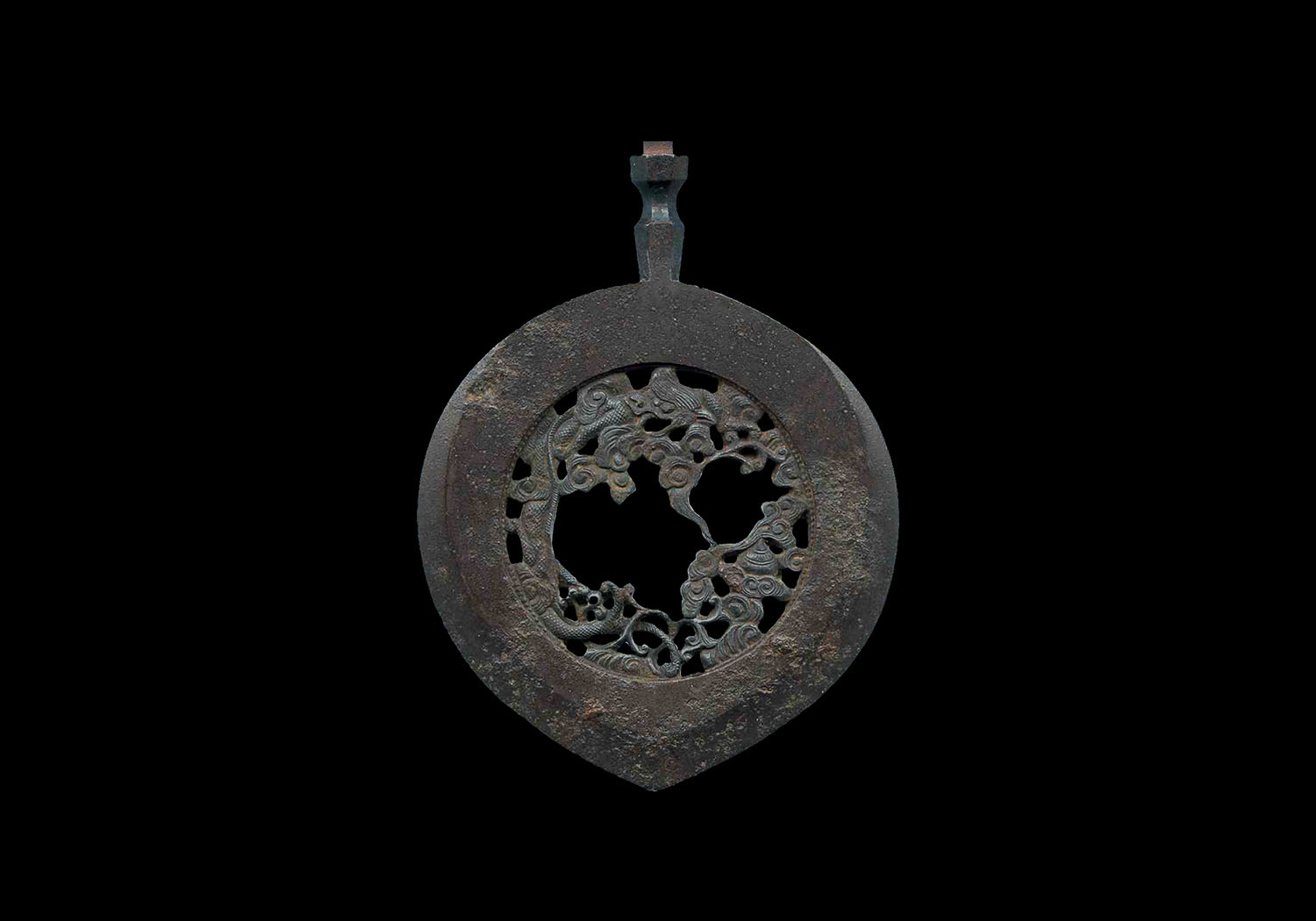 The theme is of two dragons that are carved in an intertwining position. Near the tip of the blade, the two tails wrap around each other without touching, the tails are only 2mm thick. To judge the quality of the open work on this type of yanone, spin the yanone on the tip and see if the open work jumps back and forth. If it jumps the shape is not symmetrical. This yanone does not have that problem, it is a good one.