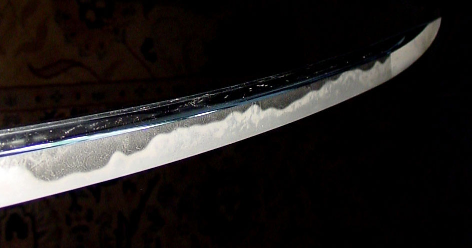 Characteristics: The construction is shinogi-zukuri with an iori-mune. The blade is wide and thick, and the shinogi is high. The curvature is rather shallow, and there is an ô-kissaki. The kitae is itame-hada with flowing areas that is covered in ji-nie, and there is chikei activity. The hamon is gunome-chôji with a mixing in of ko-notare. This is a large patterned, extremely busy midare-ba that contains ashi and yô activity. The habuchi is well covered in nie, and there are streaks of sunagashi. There is also tobiyaki and yubashiri activity. The bôshi is midare-komi with a slightly ko-maru tip, brushing and a hint of kuzure. There are bôhi carvings on both sides of the blade that taper off onto the nakago. The nakago is ô-suriage, and the end is kiri. The yasurime are kiri, and there is one mekugi-ana. The blade is unsigned.