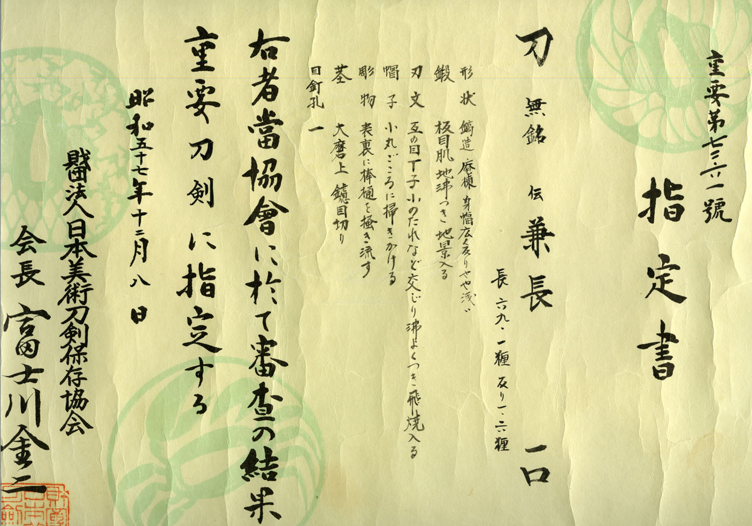 Designated Jûyô Tôken at the 29th Shinsa of December 8th, the 57th year of Shôwa (1982)