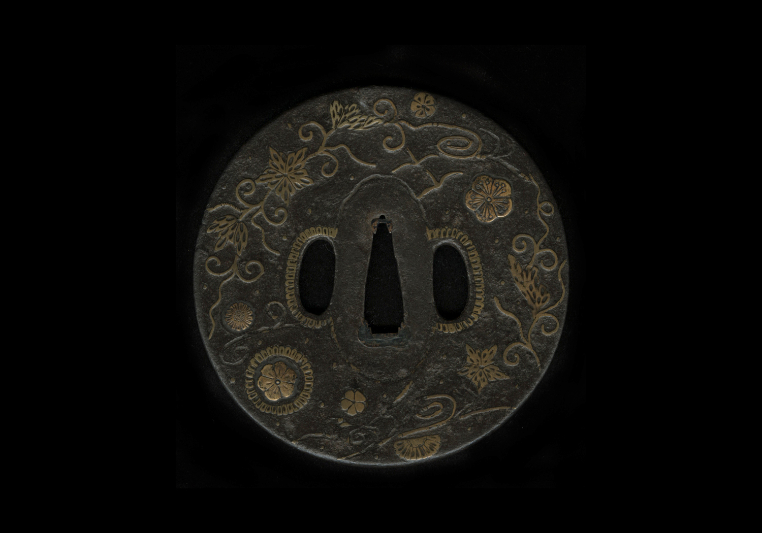 Ônin-tsuba are thin iron ita-tsuba which show a brass zôgan ornamentation. All of them are mumei and there is the theory that they were made in the Ônin era (応仁, 1467-1469) although today more and more the theory is accepted that they are in general late Muromachi period works. There are two kinds of brass zogan interpretations: One depicts irregularly arranged tachibana branches, wild geese, chrysanthemums, flowers, or karakusa, and the other one shows punctual (raised dots) zôgan elements, which are referred to as hoshi-zôgan or ro-zôgan, and concentrical zôgan elements between the nakago-ana and the rim. The latter interpretations might also be accompanied by simple ko-sukashi in the form of butterflies, clouds, hats, or stylized mountains.