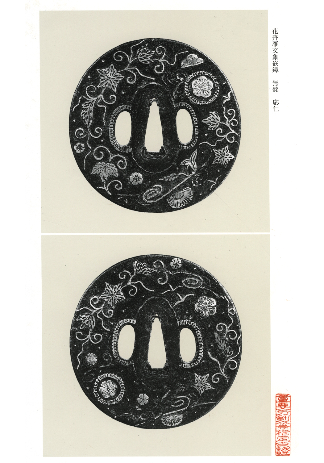 Kaki-karimon zôgan-tsuba (花卉雁文象嵌鐔) – Tsuba with zôgan design of flowers and wild geese.