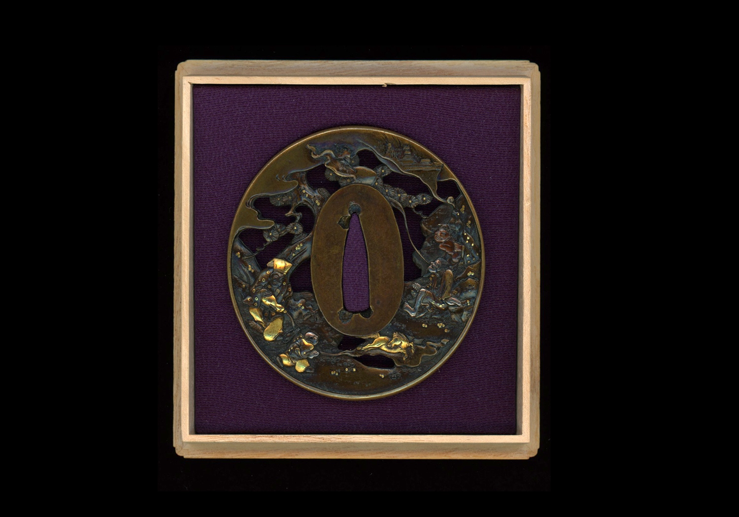 Sukashi-tsuba depicting three enlightened Taoist immortals