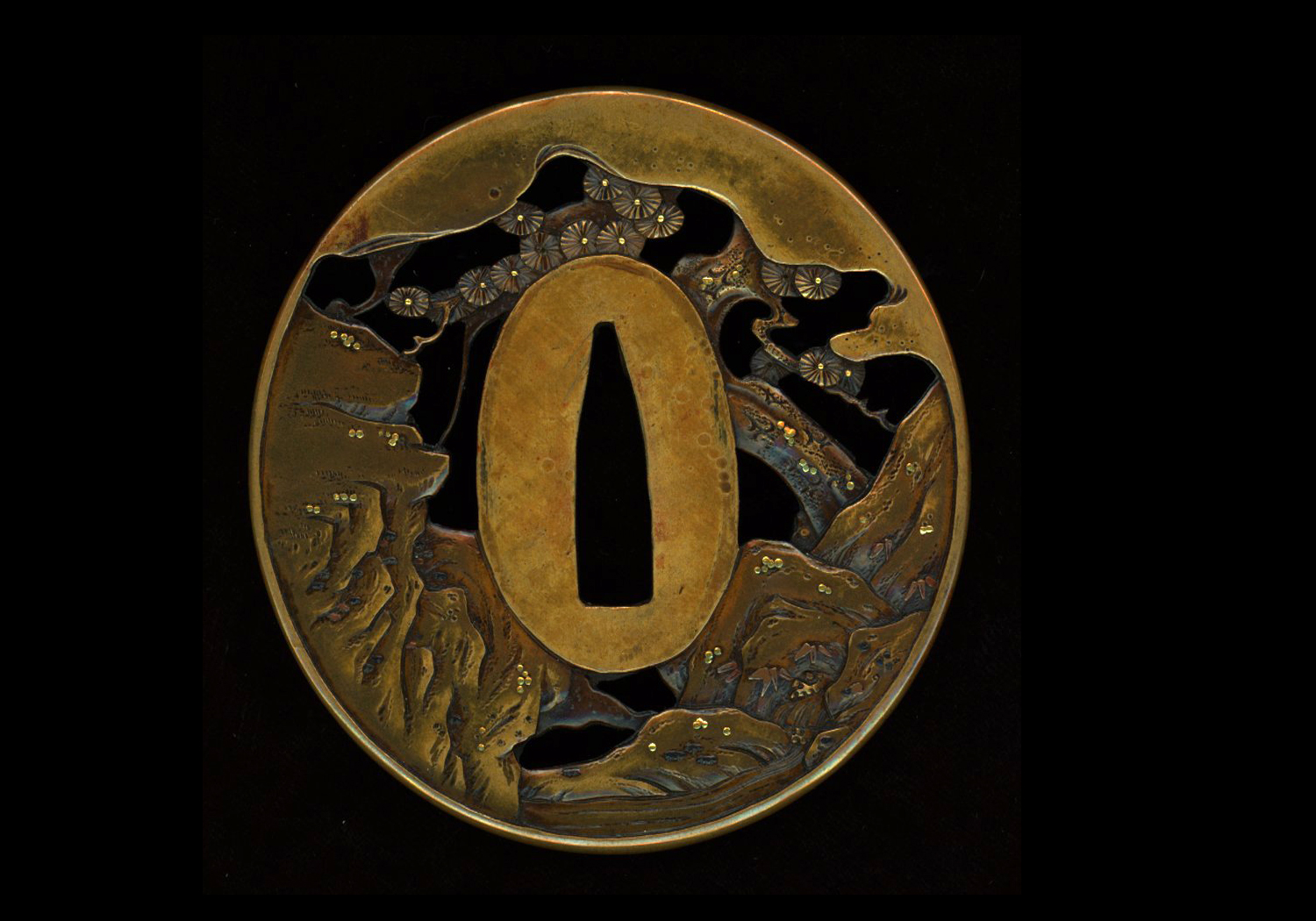 Tatemaru-gata, brass, polished finish, nikubori ji-sukashi, zôgan-iroe, sukinokoshi-mimi