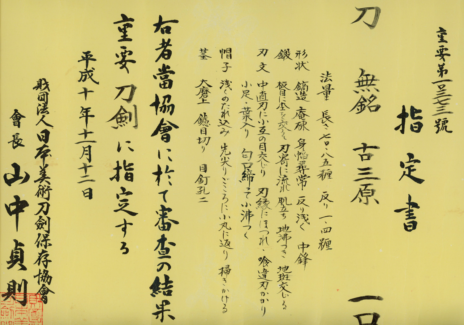 This sword comes with NBTHK Jûyô Tôken papers attesting to the quality, condition, and attribution. It is in excellent polish with no flaws or other problems. The following is the translation of the Jûyô Tôken certification papers: