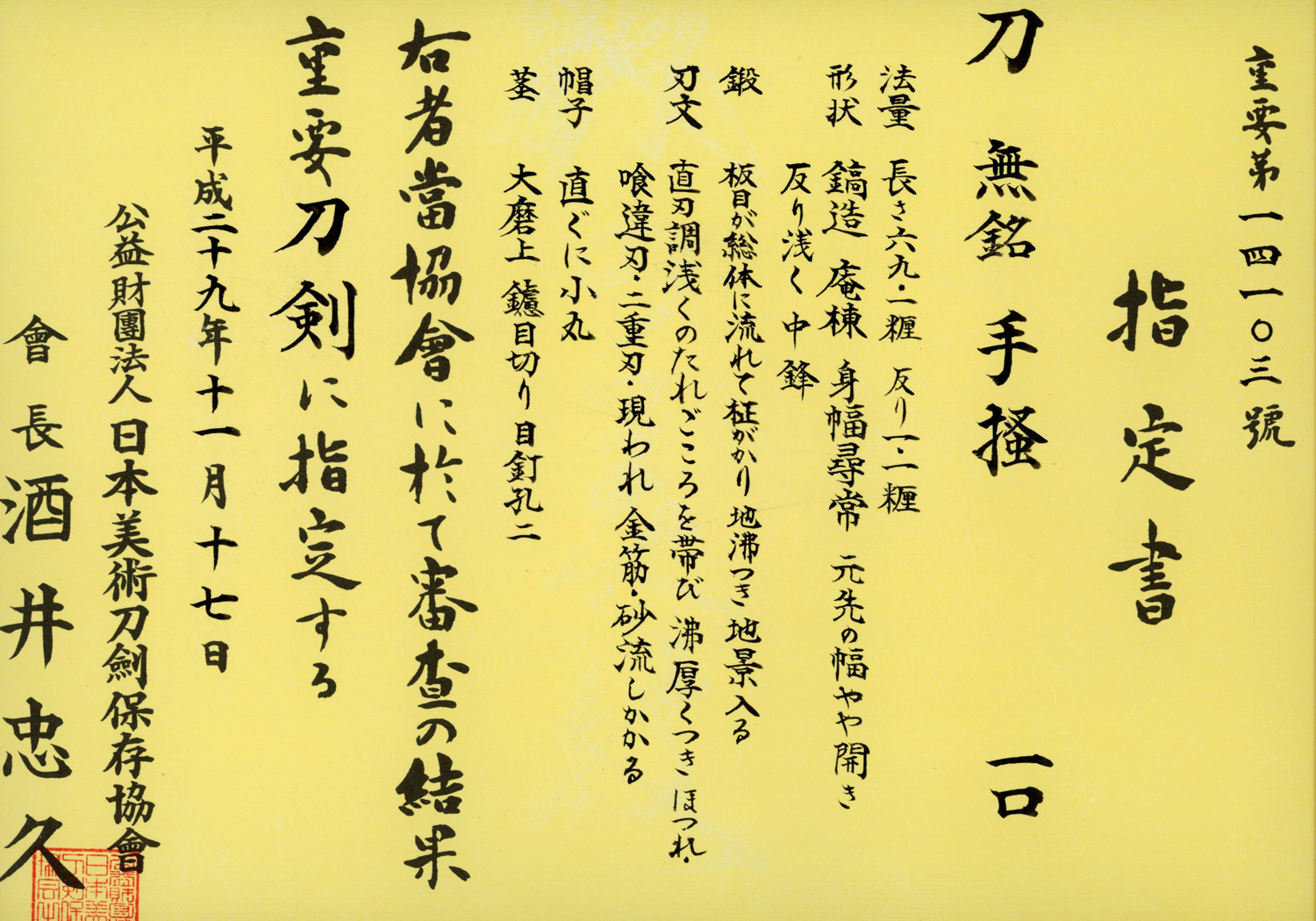 Measurements: Nagasa 69.1 cm, sori 1.1 cm, motohaba 2.9 cm, sakihaba 1.9 cm, kissaki-nagasa 3.05 cm, nakago-nagasa 19.8 cm, only very little nakago-sori.