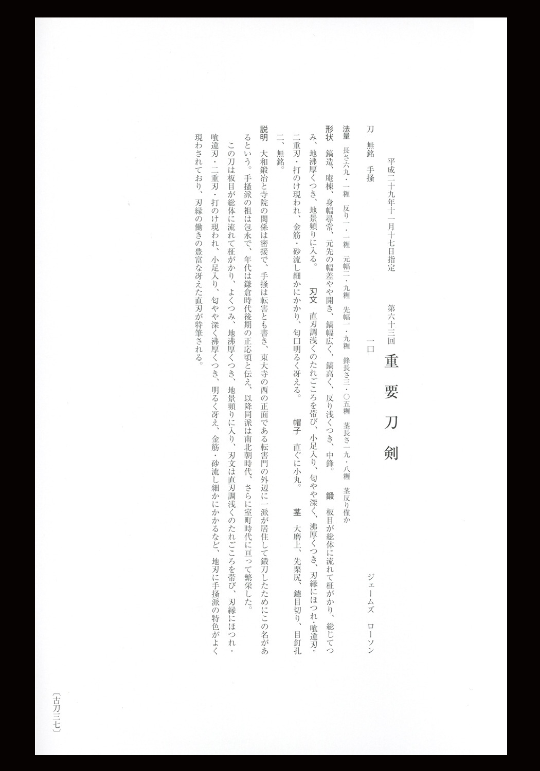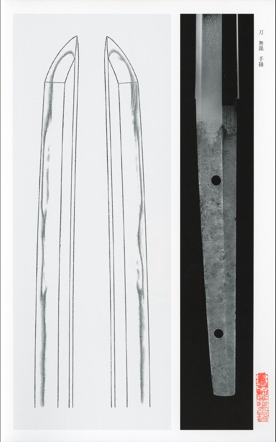 Nakago: ō-suriage, kurijiri, kiri-yasurime, two mekugi-ana, mumei.
