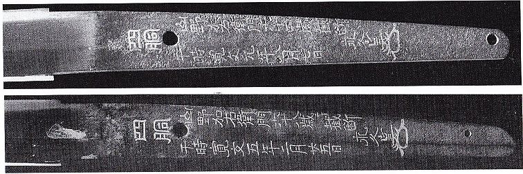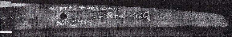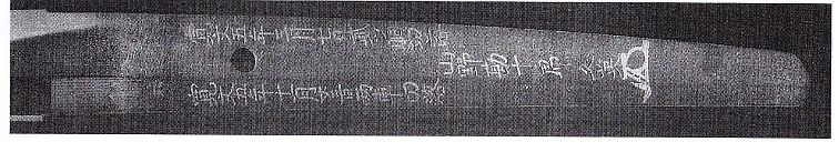 2. Kinzôgan-mei: Bingo Fukuyama ni oite (於備後福山). In Fukuyama in Bingo. Shôhô yonnen rokugatsu nijûkyûnichi dô futatsu uchiotoshi Asari Yasuke no kiri (正保四年六月廿九日胴二ッ重 打落浅利弥介切之). Asai Yasuke cut through two bodies on the 29th day of the sixth month Shôhô four [1647]. From the Nagasone Kotetsu Shinko.