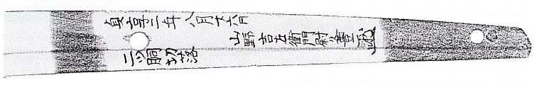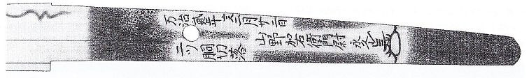 The kinzôgan-setsudan-mei of the Yamano family from the early Edo period focus on works of the smiths Izumi no Kami Kaneshige (和泉守兼重), Kazusa no Suke Kaneshige (上総介兼重), Yamato no Kami Yasusada (大和守安定) and Nagasone Kotetsu (長曽祢虎徹). There are no cutting tests of the Yamano family known which were carried out on blades of bakufu-employed smiths. So we can see a close relationship to the Kaneshige line, very similar to the close relationship of the Yamada family to the Koyama Munetsugu line.