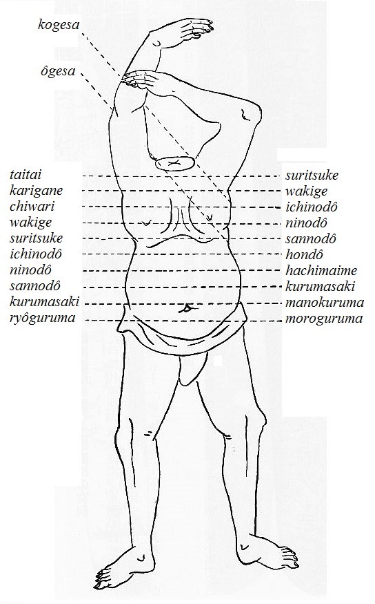 The Yamano family preferred central body cuts (see numbers 11, 12 and 13 in the illustration below) as well as karigane, wakige and ryô-kuruma. The difficulty or the challenge for a blade was mostly increased by the number of bodies layered on top of each other. This practice was called “kasane-dô” (重胴). The majority of all Yamano tests mention cuts through two or three bodies, i.e. “futatsu-dô” (二ッ胴・貳ッ胴) or “mitsu-dô“”(三ッ胴・参ッ胴) respectively.