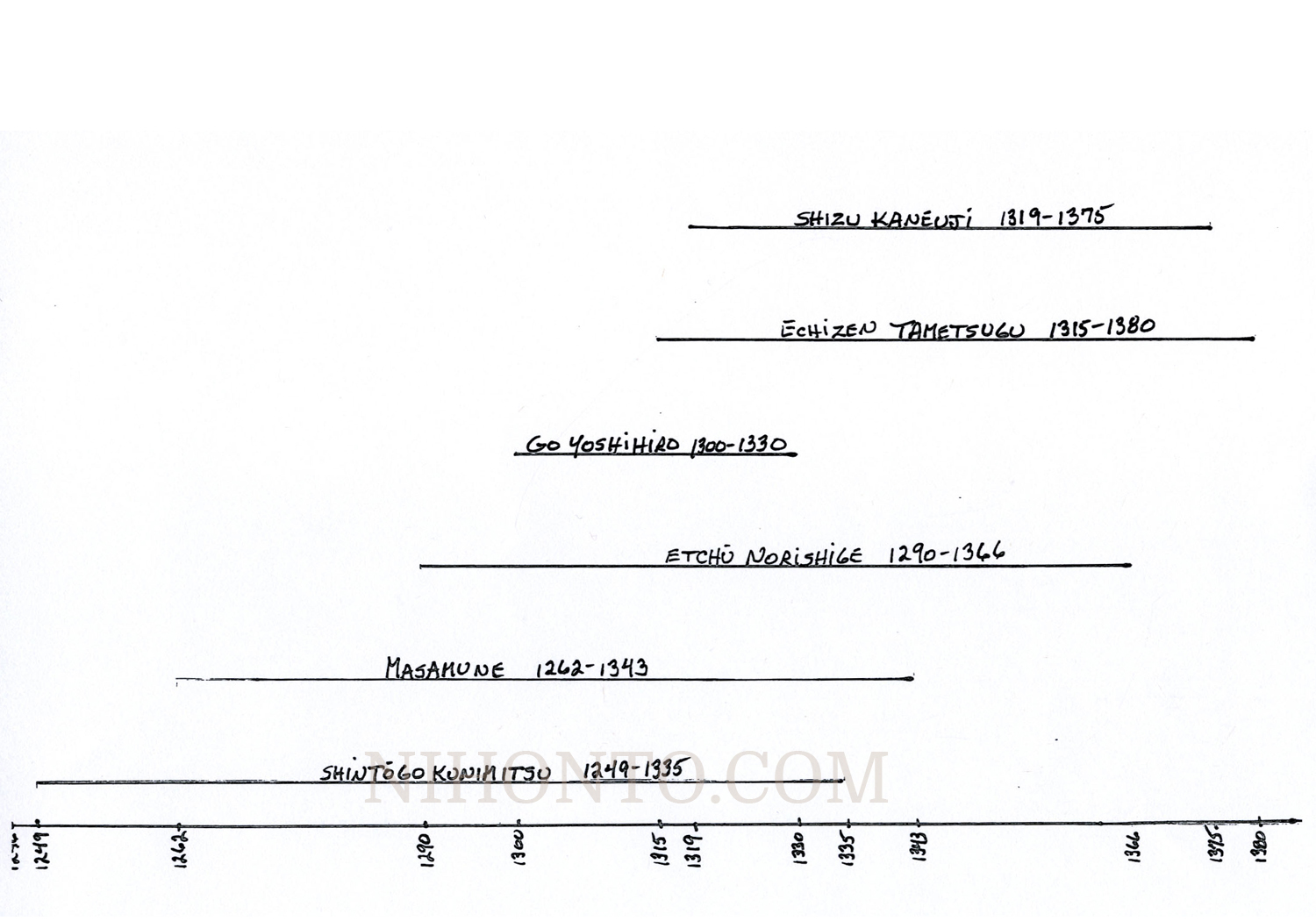 When we study the history and genealogy of sword smiths who lived 650 or more years ago, we have very few facts to go on and must rely heavily on old texts that were often written hundreds of years after the smiths died or on old oral traditions. Fortunately, we do have one source of reliable information that many smiths left for us, i.e. some of them occasionally chose to put dates on their blades.