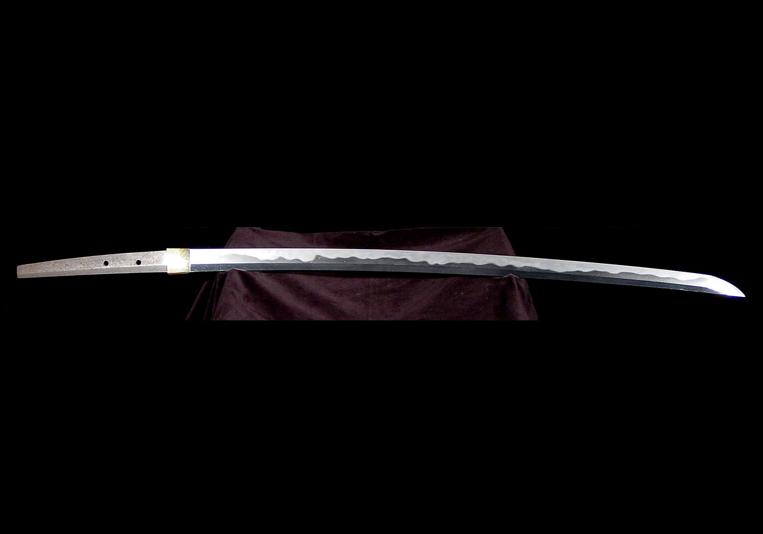 Characteristics: The construction is shinogi-zukuri with an iori-mune. The shinogi is somewhat wide. The blade is deeply curved and there is an ô-kissaki. The kitae is itame with a slight mixing in of mokume, and there is also a slight mixing in of ô-hada. The jigane is covered in ji-nie. The hamon is gunome-midare with a slight mixing in of ko-notare. There is ashi and yô activity here and there. There are repeated streaks of sunagashi. The habuchi is well covered in nie. There is slight kinsuji activity as well as tobiyaki. The bôshi is heavily brushed and slightly ko-maru. The nakago is ô-suriage, and the end is cut off straight across. The yasuri on the omote are kiri, and on the ura from around the middle of the nakago and below, they are sujikai. There are two mekugi-ana, and the blade is mumei.
