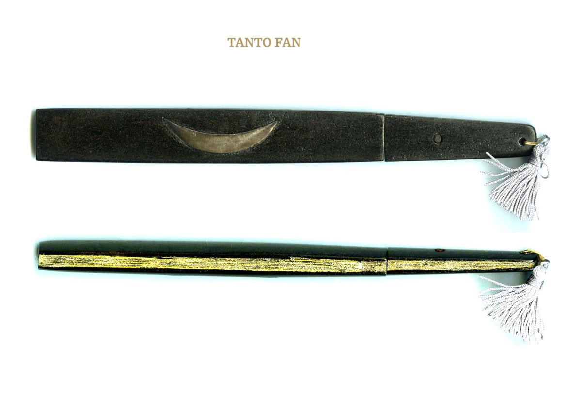 I am calling this newest addition to my mezurashii mono collection of unusual things, moon over my fanny (apologies to Edgar Leslie). Outwardly it is a black fan with a large silver crescent moon, yet within is a deviously concealed little tanto. Judging by its size, it was made for a Samurai maiden to give her the means to defend her honor should the occasion arise. Cute, huh?