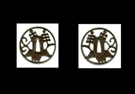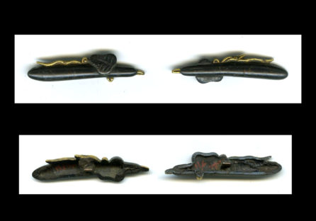 Read moreThis is a nice pair of dark shakudo and gold menuki. They look to be from the ko-kinko school.