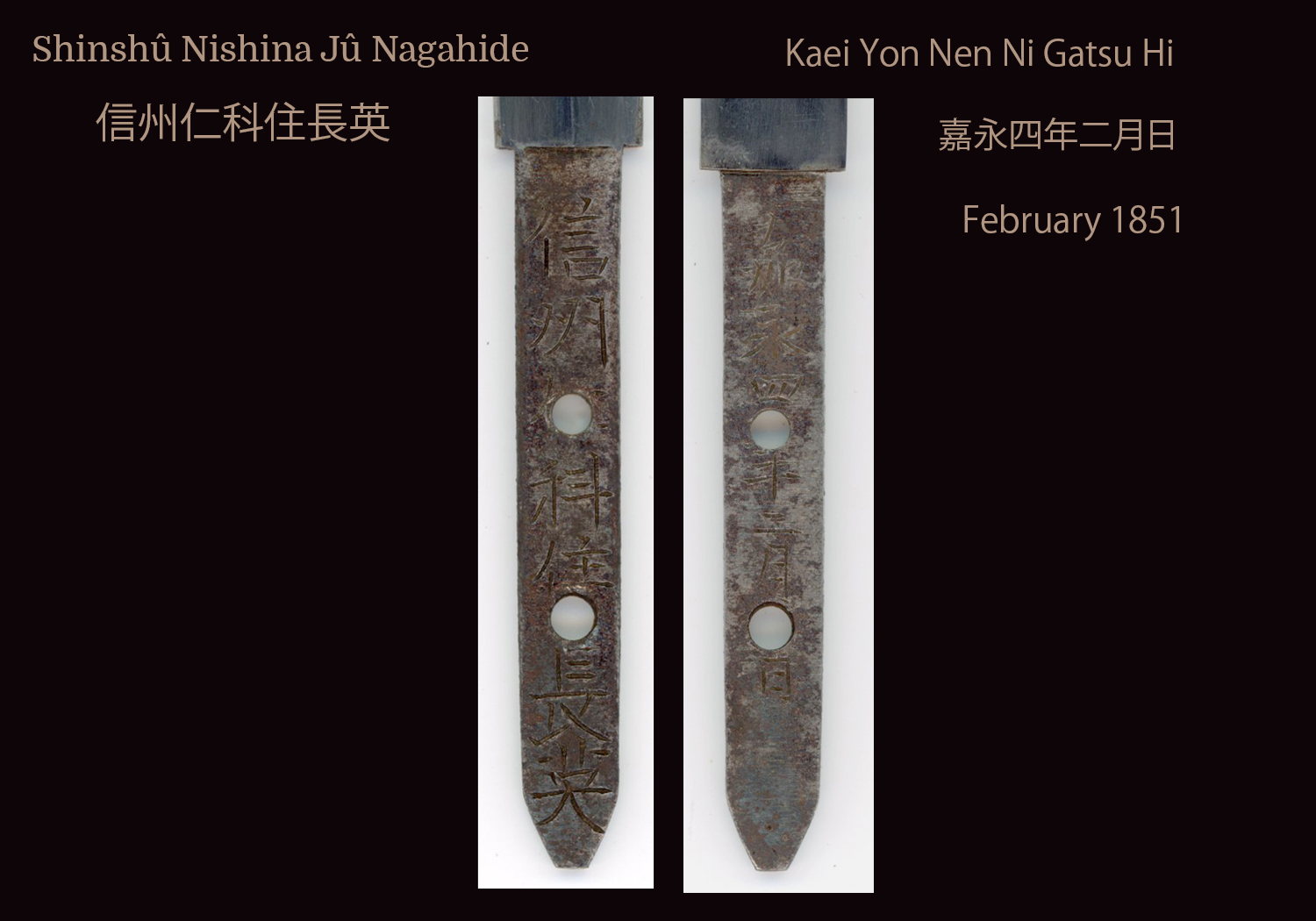 This yari was made by the sword smith Nagahide who was from Shinano province. He worked around the Kôka and Kaei eras (1844-1864). The nakago of the yari is signed Shinshû Nishina Jû Nagahide (信州仁科住長英) and it is also dated as having been made on a day in February of the fourth year of Kaei (嘉永四年二月日 (1851)).