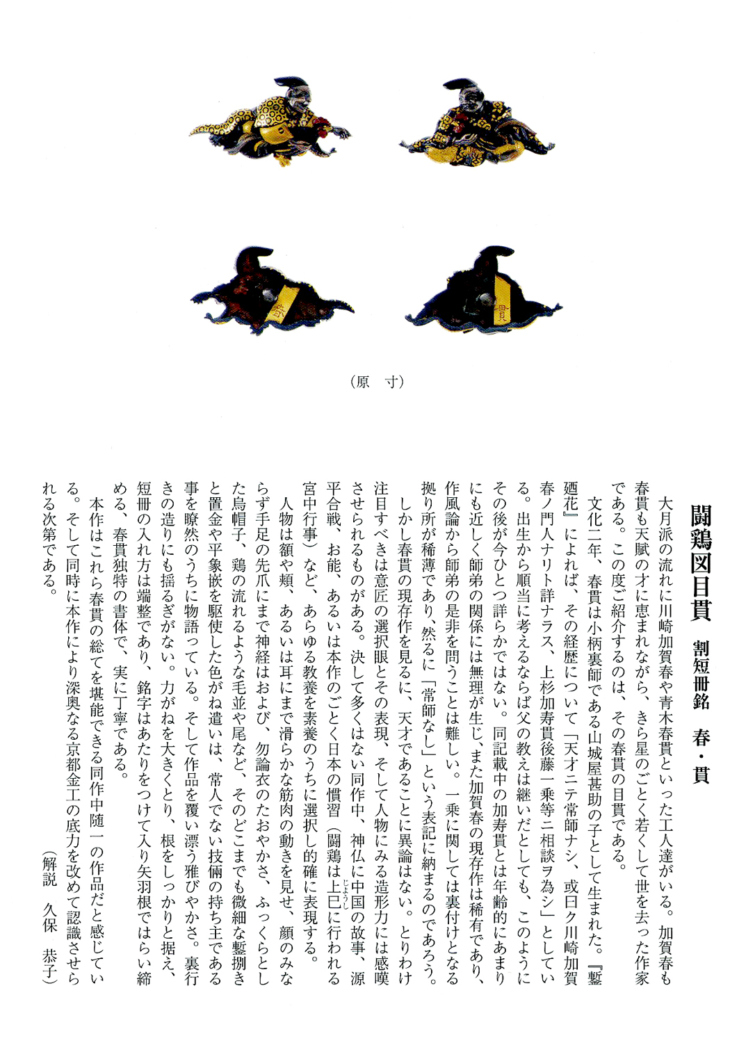 This set of menuki shows the epitome of Harutsura’s skills.  The motif is that of two noble gentlemen (courtiers) each restraining a fighting cock in his lap.  These menuki were awarded the status of Jûyô Tôsôgu at the 62ndJûyô shinsa held on October 18, 2016.  The translation of the Jûyô papers is as follows: