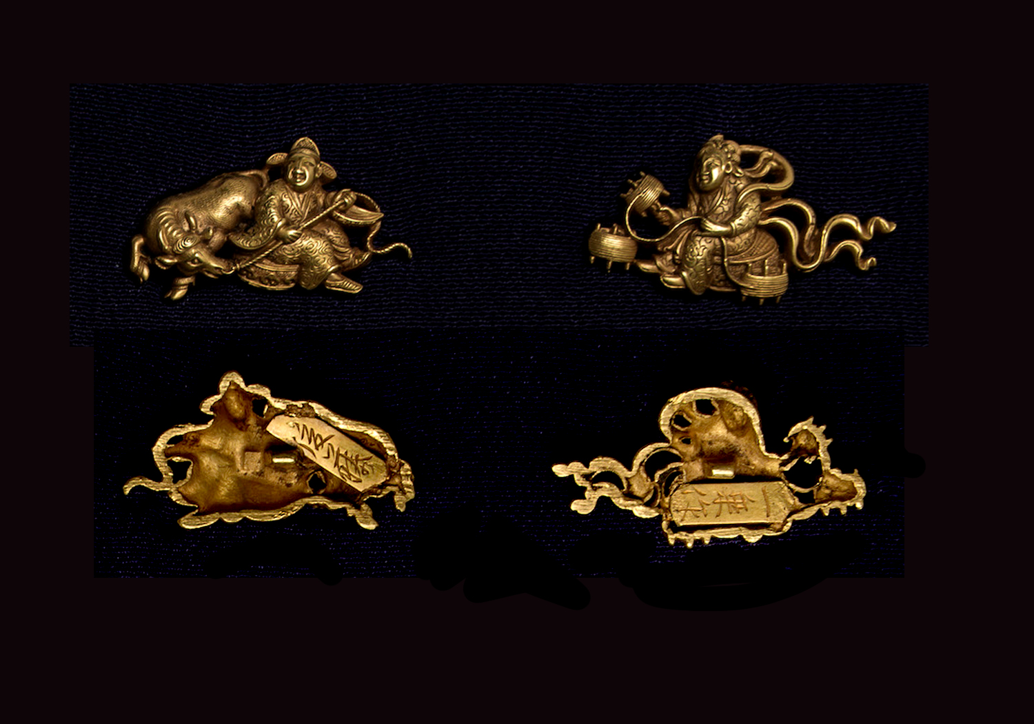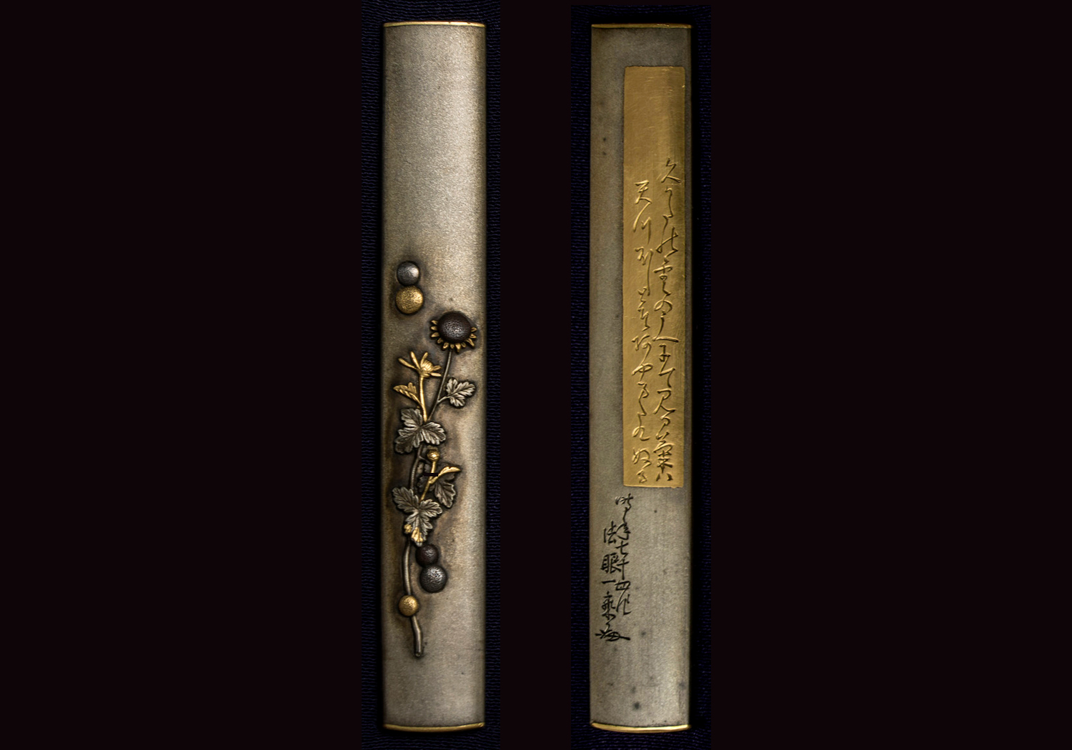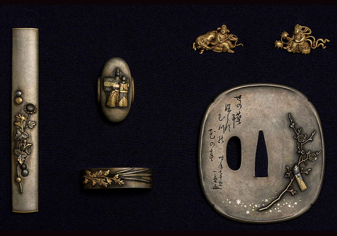The traditional Five Festivals, the subject of this set of fittings, started in the first month with the White Horse seasonal court banquet (aouma no sechi-e, 白馬節), followed in the third month by the Doll’s Day (hina no sekku, 雛の節句), in the fifth month by the Water Lily or Boy’s Day (ayame no sekku, 菖蒲の節句 or respectively tango no sekku, 端午の節句), in the seventh month by the Star Festival (tanabata, 七夕), and was concluded in the ninth month by the Chrysanthemum Day (kiku no sekku, 菊の節句or also referred to as chōyōno en, 重陽の宴). Except for the menuki, Ichijō worked all the individual traditional festivals out of oborogin. The takabori carvings are delicate and he made much use of iroe, all of course in an elaborate manner, and so this set shows very well the characteristic features of Ichijō. The set is also depicted in volume 1 of the book Tagane no Hana.
