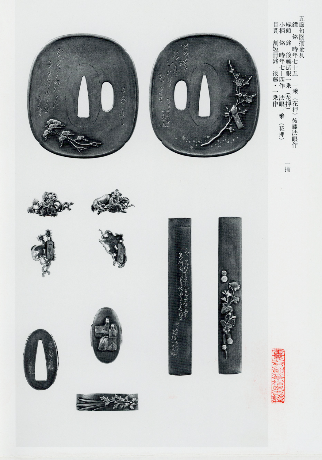 The set of Juyo Tôsôgu presented here is an extraordinarily fine example of his work. It represents the five famous festivals and is done in shibuichi and gold. The following is a translation of the Jûyô Tôsôgu zufu that was issued in 1984: