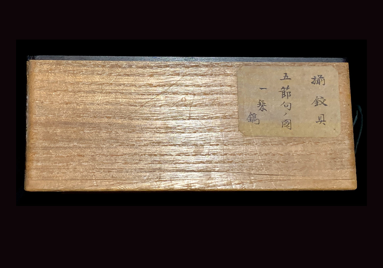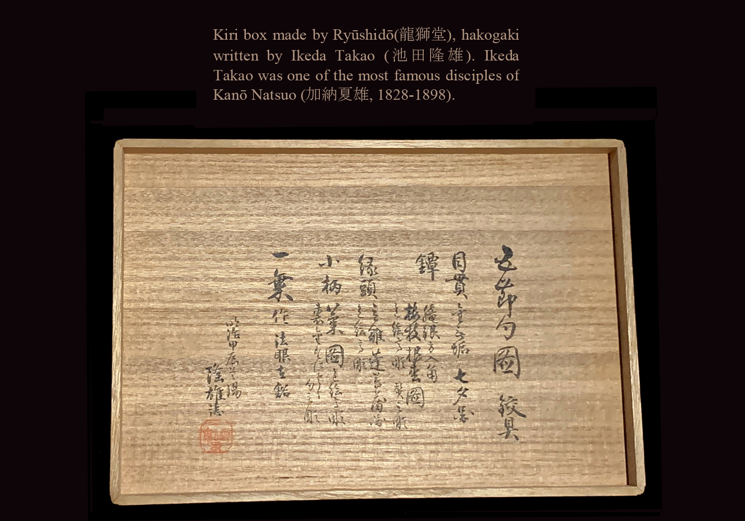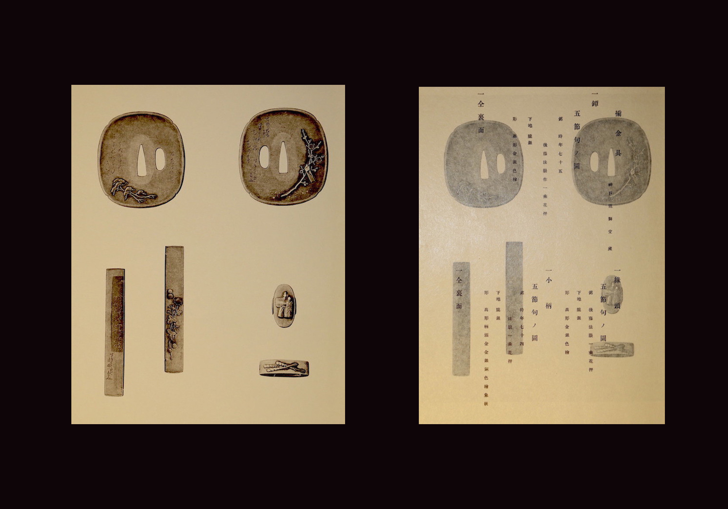 As noted in the Jûyô description, , this set is published in volume #1 of Tagane no Hana, an important work on fittings written by Mitsumura Toshimo (光村利藻, 1877-1955), also known as Ryūshidō (龍獅堂). Ryūshidō (龍獅堂) was a major sword and sword fittings collector of the Meiji, Taisho, and early Showa eras. This set of fittings was among his personal collection. You will note that this set comes with a custom made wooden box. The inscription on the inside of the lid of the box was written by Ryūshidō (龍獅堂).