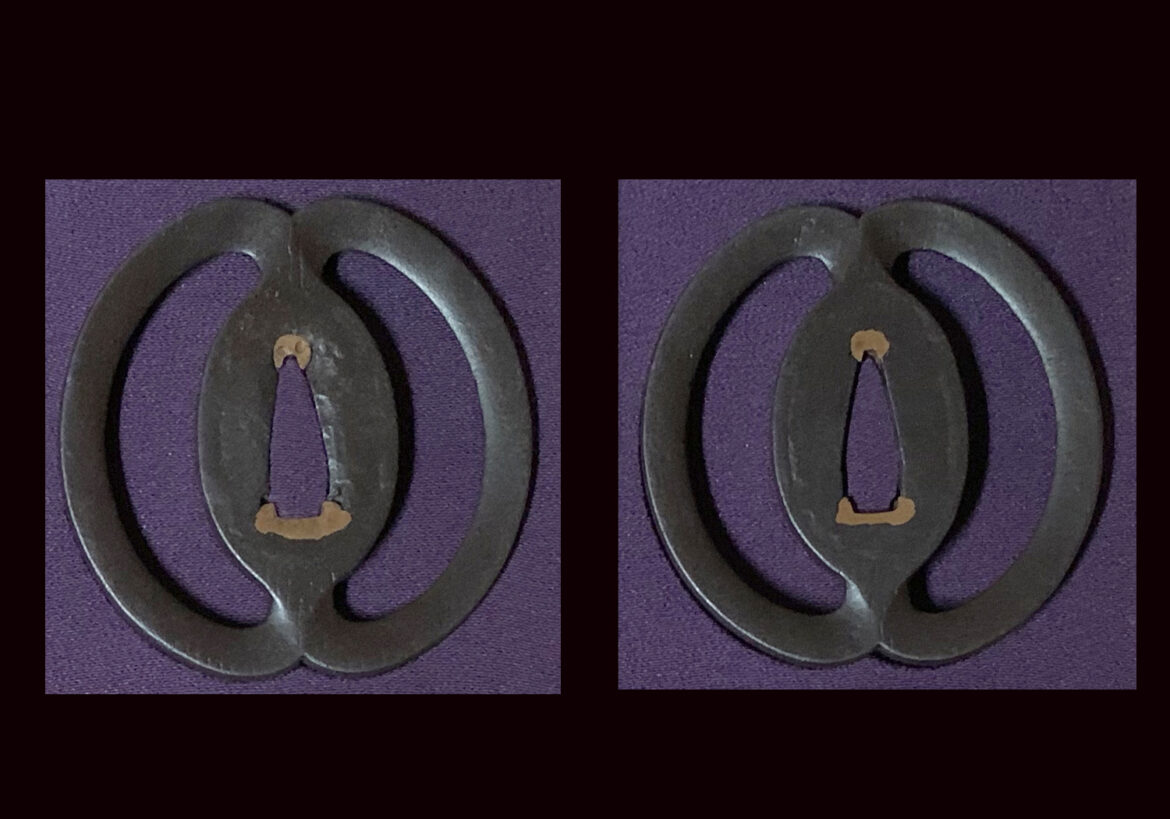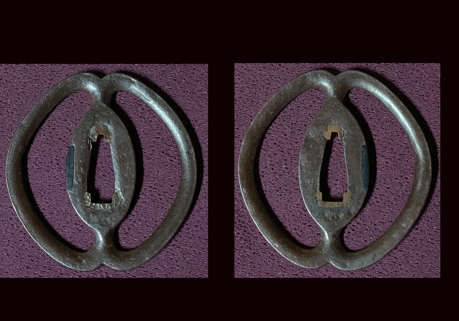 The above namako-sukashi tsuba (海鼠透鐔) tsuba is another of the famous tsuba by Miyamoto Musashi. This tsuba was presented in the recent publication by Itô Mitsuru entitled, Works of Hayashi and Kamiyoshi. It is listed as number 8 of the items attributed to Miyamoto Musashi and is described as follows: