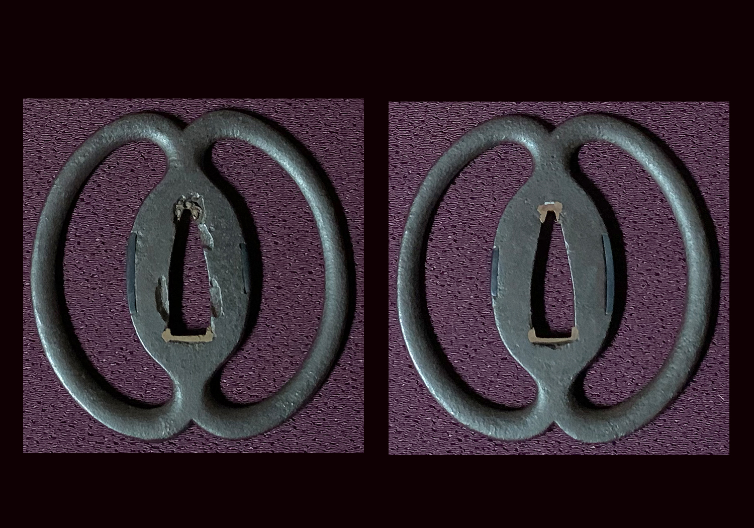 “The iron is black and not very glossy and the two-fold mokkô-gata has namako-sukashi opened to the left and the right. The inward plane of the sukashi is strongly and sharply bevelled and provides variety and tension. The rim was worked with the hammer and has some folded-over areas. The piece itself has a subtle flickering appearance and some delicate kebori elements towards the top and bottom areas. This is a tsuba that suggests Musashi’s mind and world of ideas. To produce such a highly spiritual piece is probably left to a man of the martial arts like Musashi.”