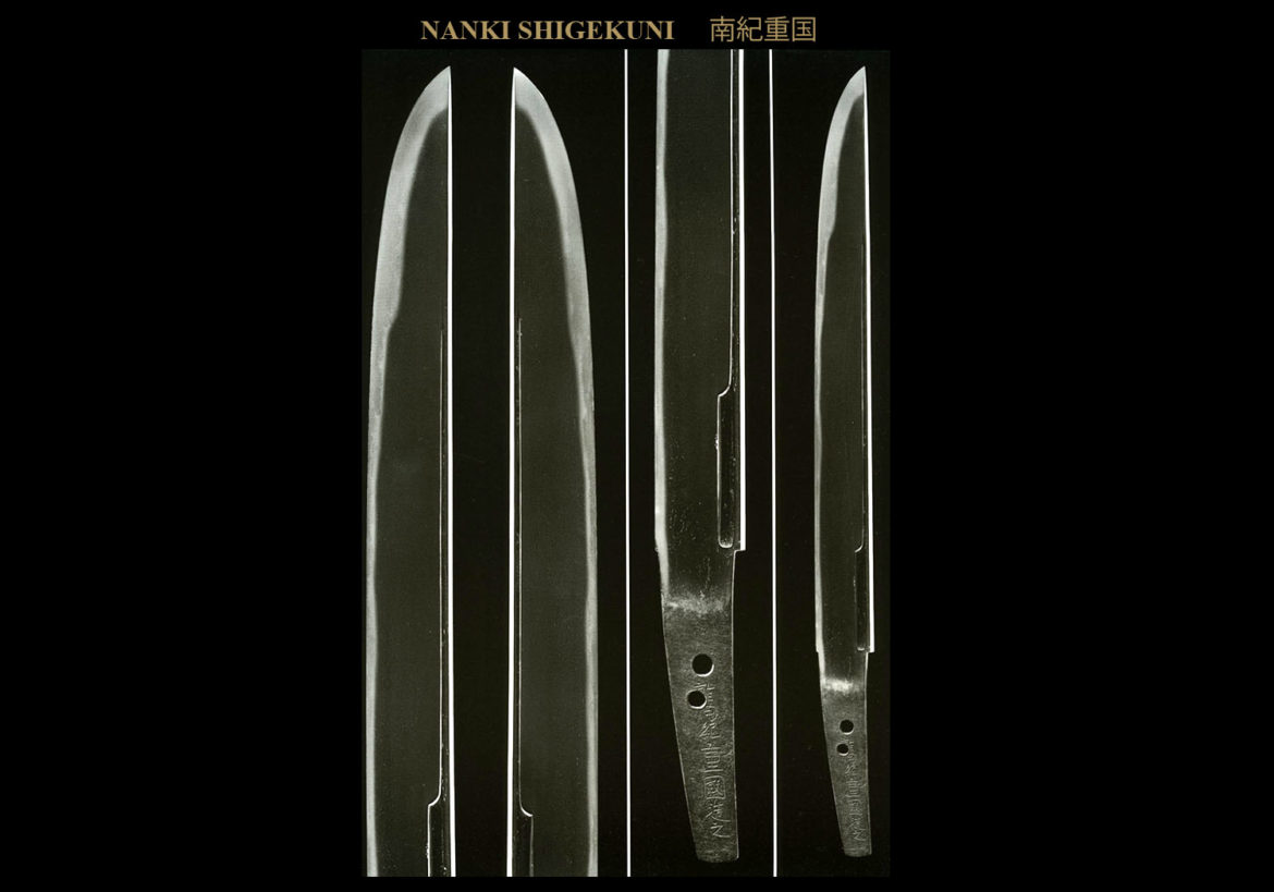 Shigekuni (重国) is acknowledged to have been one of the finest sword smiths of Shinto times. In terms of skill, Shigekuni (重国) vied for the top rank with Horikawa Kunihiro (堀川国廣) among all the Keicho Shinto smiths. His strength in producing bright and clear ji and ha was second to none among his contemporaries. He left many examples of his work. He was known for making long swords and unfortunately many have been shortened in later times. We are fortunate that Shodai Nanki Shigekuni (初代南紀重国) left many examples with his personal history recorded within his signatures as to where he was living at different times in his swordmaking career. We find such examples as WASHU TEGAI no JU SHIGEKUNI SUNPU ni OITE KORE o TSUKURU (和州手掻住重国駿府於之作). Signatures like this are very specific as to where he was living at the time he made a sword. By comparing the different styles of his chiseling with examples that are dated, we can pin down the more exact time of when he lived in the various locations.