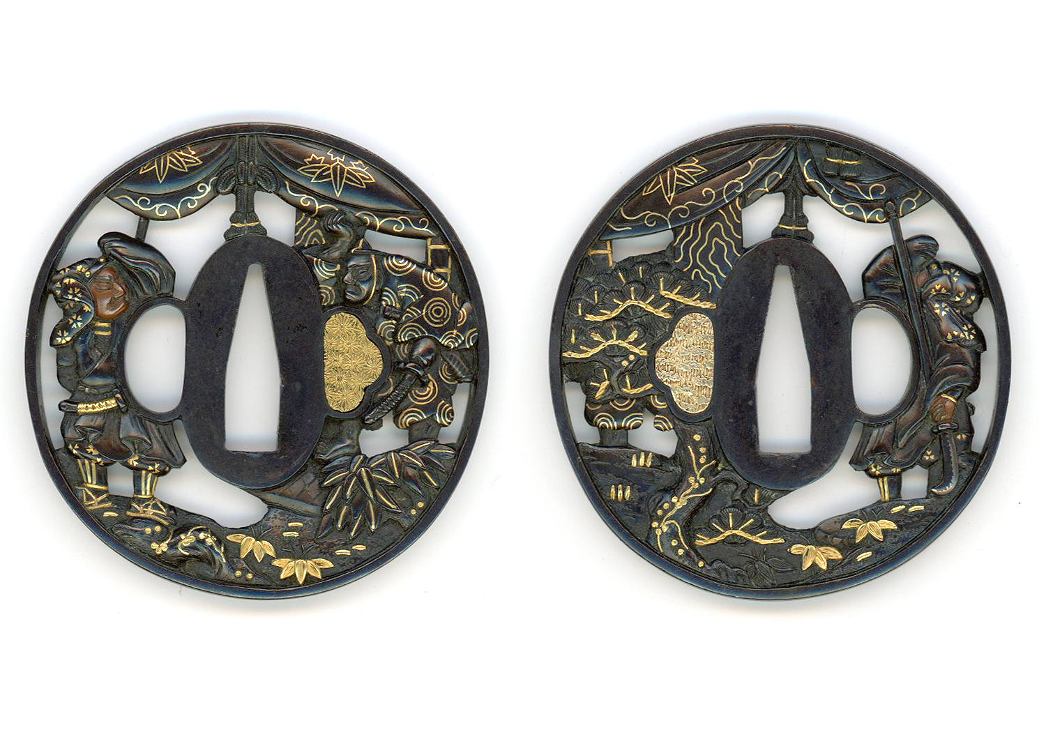 This tsuba is slightly oval and measures 2 7/8 inches by 2 13/16 inches, suitable for a katana or a wakizashi. The face of Yoshitsune is done in copper and that of Benkei is done in shakudo. The balance of the tsuba including clothing, weapons, plants, bridge, etc. are all done of shakudo with gold highlights and decorations.