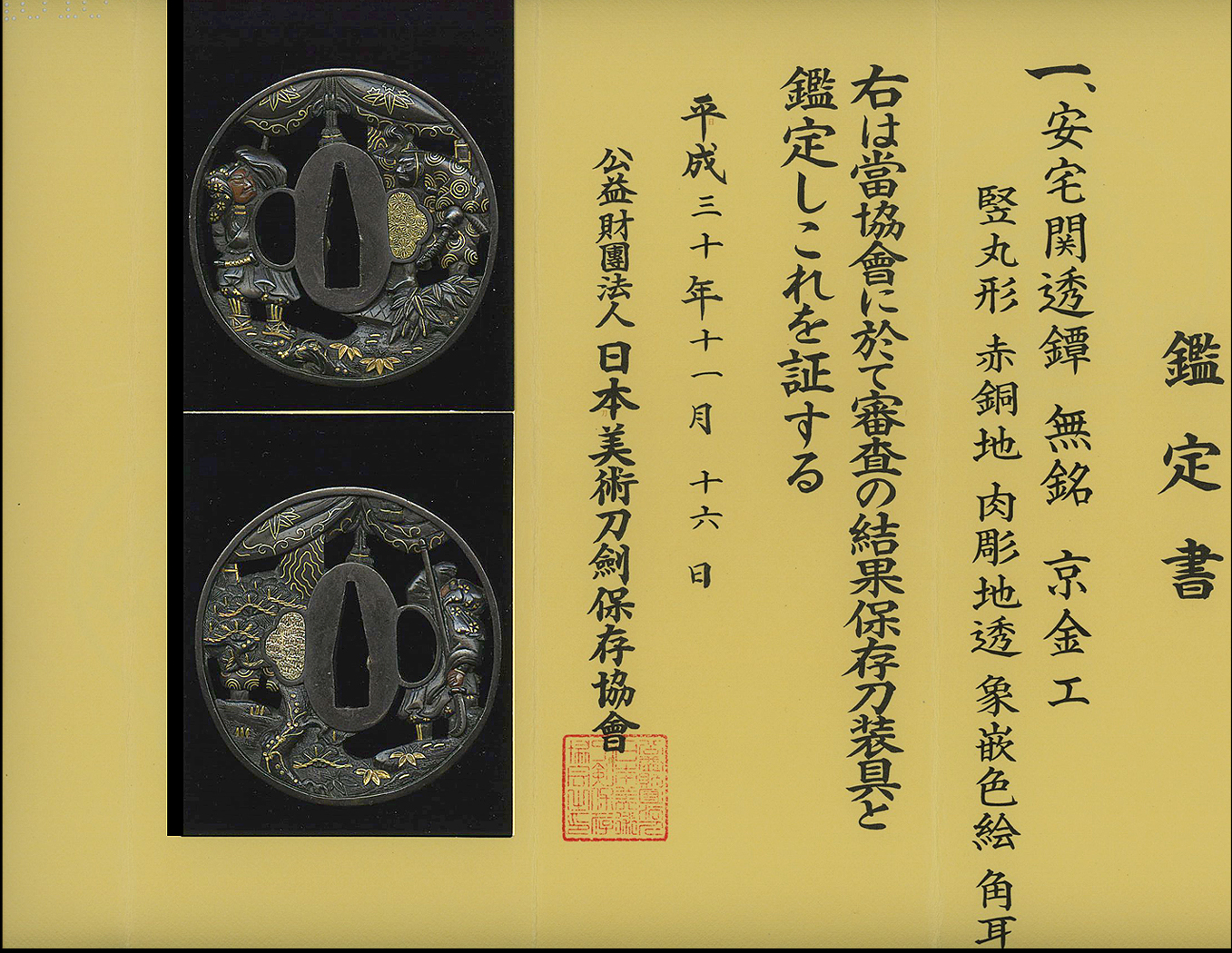 This tsuba comes with NBTHK Hozon papers attesting to its authenticity and quality. It is also contained in a custom made wooden box. All in all, a most wonderful piece of Samurai art.