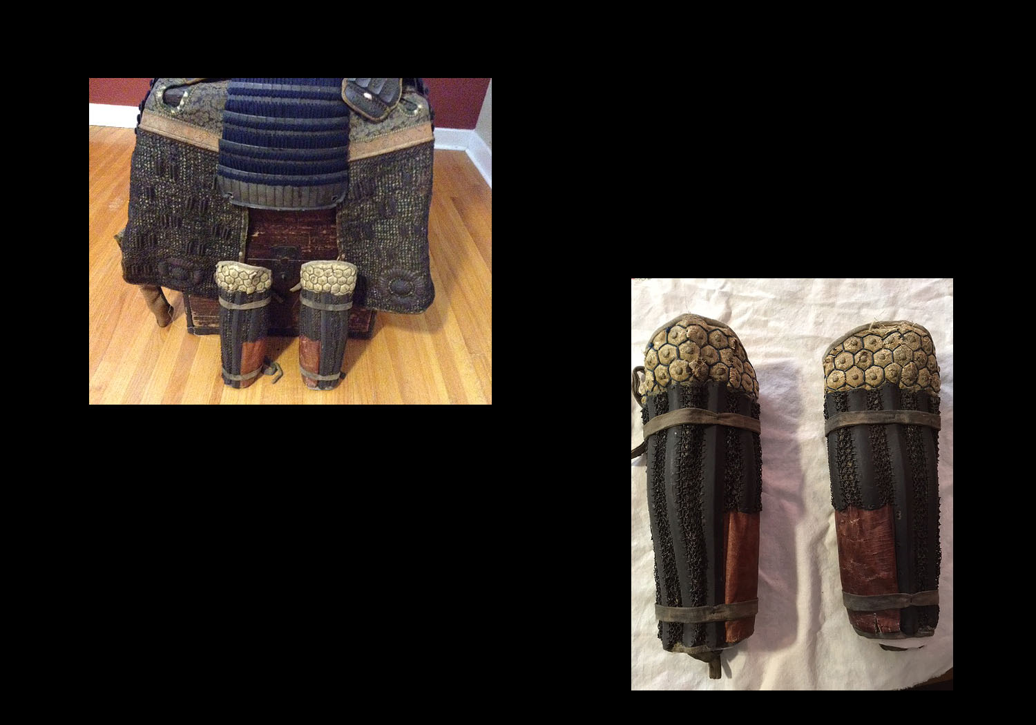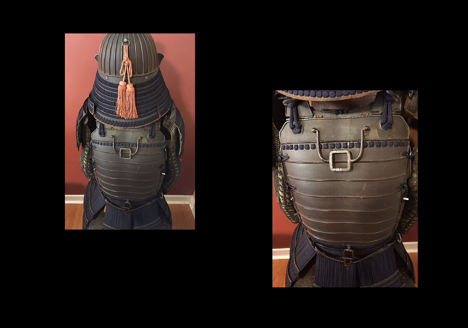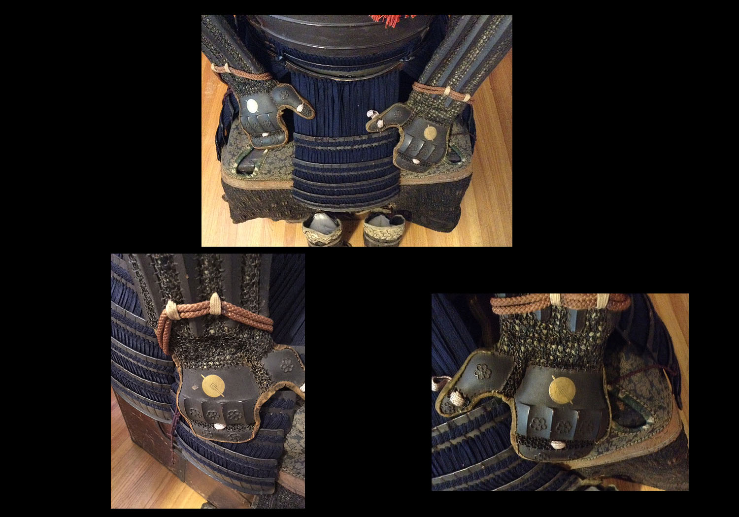 This is a very nice suit of armor from the middle Edo period. The helmet is an unsigned 32 plate russet iron suji kabuto with a five stage teihen. The visor (mabezashi) is attached to the kabuto with three large rivits and the edge has a silver fukurin done in a rope pattern. You will note that this same silver edging is carried out throught the armor at the top edge of the do (main body armor). It has a five lame shikoro with the top lame having fukigaeshi bearing a family mon. The bottom lame has inome (boar’s eyes) located on the bottom front. The russet iron menpo is well made and sports a fine horse hair mustache and goatee. The yodara kake (throat guard), sode (shoulder guards), do and gessen (body armor) are all kebiki laced in a blue ito that is in excellent condition throughout the entire armor. The kote (arm protection) and haidate (thigh protection) are covered with a finely made chain mail with inlaid iron plates of various shapes. The hand protectors of the kote also bear the same family mon as is found on the fukigaeshi of the shikoro. The sode also have inome (boar’s eyes) matching those on the shikoro. The suneate (calf protectors) have iron plates sewn into a thick fabric to protect the knees and iron plates and chain mail to protect the lower legs. The overall condition of the suit is excellent.