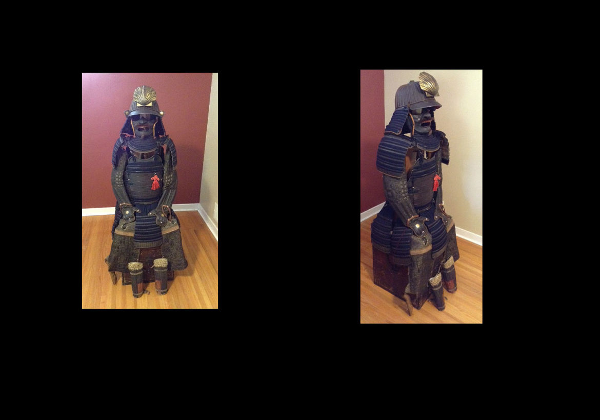 This is a very nice suit of armor from the middle Edo period. The helmet is an unsigned 32 plate russet iron suji kabuto with a five stage teihen. The visor (mabezashi) is attached to the kabuto with three large rivits and the edge has a silver fukurin done in a rope pattern. You will note that this same silver edging is carried out throught the armor at the top edge of the do (main body armor). It has a five lame shikoro with the top lame having fukigaeshi bearing a family mon. The bottom lame has inome (boar’s eyes) located on the bottom front. The russet iron menpo is well made and sports a fine horse hair mustache and goatee. The yodara kake (throat guard), sode (shoulder guards), do and gessen (body armor) are all kebiki laced in a blue ito that is in excellent condition throughout the entire armor. The kote (arm protection) and haidate (thigh protection) are covered with a finely made chain mail with inlaid iron plates of various shapes. The hand protectors of the kote also bear the same family mon as is found on the fukigaeshi of the shikoro. The sode also have inome (boar’s eyes) matching those on the shikoro. The suneate (calf protectors) have iron plates sewn into a thick fabric to protect the knees and iron plates and chain mail to protect the lower legs. The overall condition of the suit is excellent.