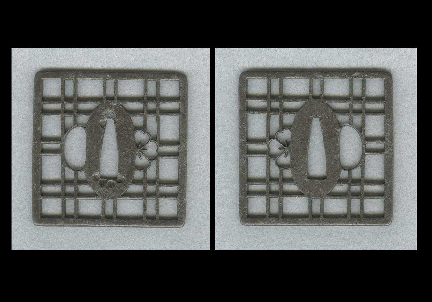 This is an iron tsuba from the Kyô-Sukashi school. It dates to the Edo period (18th century). It has a somewhat unusual shape that is square with a lattice design. It measures 7.4 cm or 2.90 inches square. The design is enhanced by a partial cherry blossom being carved in negative sukashi where the kogai-ana would be. There is a slight bit of metal loss to the delicate kozuka-ana. This tsuba comes with NBTHK Hozon papers attributing it to the Kyo-sukashi school and certifying the time period.