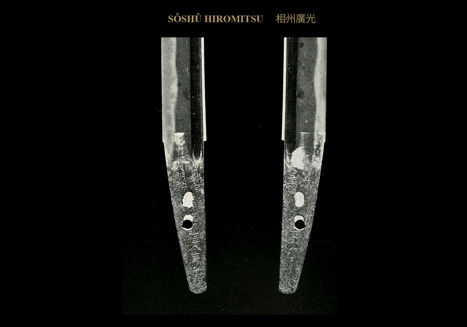 Hiromitsu (廣光), according to the old authorized books, Kodensho and Kokon Mei-zukashi, is unanimously considered a student of Masamune (正宗). Most of his extant examples carry the dates of Bunwa (文和1352-1355), Enbun (延文1356-1360), Kôan (康安1361) and Teiji (貞治1362-1368), but the earliest date goes back to the first year of Kan-ô (觀応1350). The mei inscriptions on the works in the Kanno days are all nagamei or long mei inscriptions. In terms of the order of Masamune’s (正宗) disciples, Hiromitsu (廣光) is surmised to have come next in line after Sadamune (貞宗).