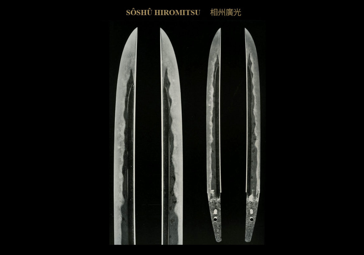 There are a couple of examples of ni-ji mei (two-character signature) which seem to be of earlier and superior workmanship to the later naga-mei examples. One of these blades is tempered in Hiromitsu’s (廣光) typical hitatsura style and the other is done in chu-suguha. It is interesting that one of these two blades is done in the chu-suguha style that is the traditional Sôshû hamon that has been passed down since Shintôgo Kunimitsu (新藤五国光). This has led to the current theory that there were, in fact, two generations of smiths by this name with the first generation being the direct student of Masamune (正宗) and the second as having worked closely with Sadamune (貞宗). As with most theories of this sort, all the facts are not in and further research and debate are required.