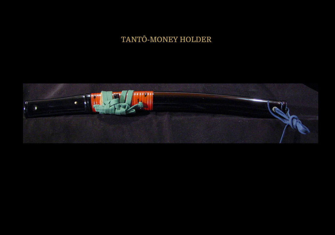 This is a tantô for the Samurai of modest means. Hidden in the bottom of the saya is a removable wooden block. When taken out, it reveals a chamber for hidden coins. I say modest means, because I was able to fit only three Ichibu gin and three Isshu gin in the compartment. Not enough money to get the Samurai in any kind of serious trouble, but certainly enough to get him one heck of a night on the town and probably in a lot of trouble with his wife.