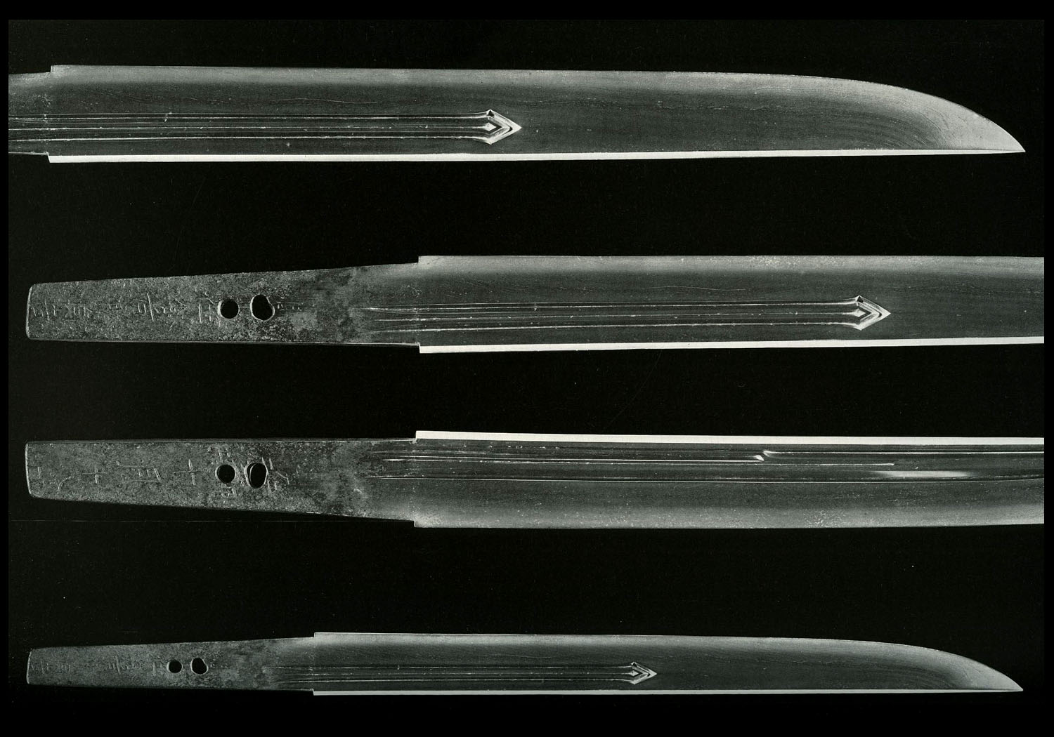 NAKAGO: Almost all of the tachi have been shortened losing their original nakago. When present, the nakago of tachi are long with a shallow sori, those of tanto are mu-sori. The saki of tachi are a shallow kurijiri, tanto are kuri. Both tachi and tanto have niku on the mune. The yasurime is higaki.