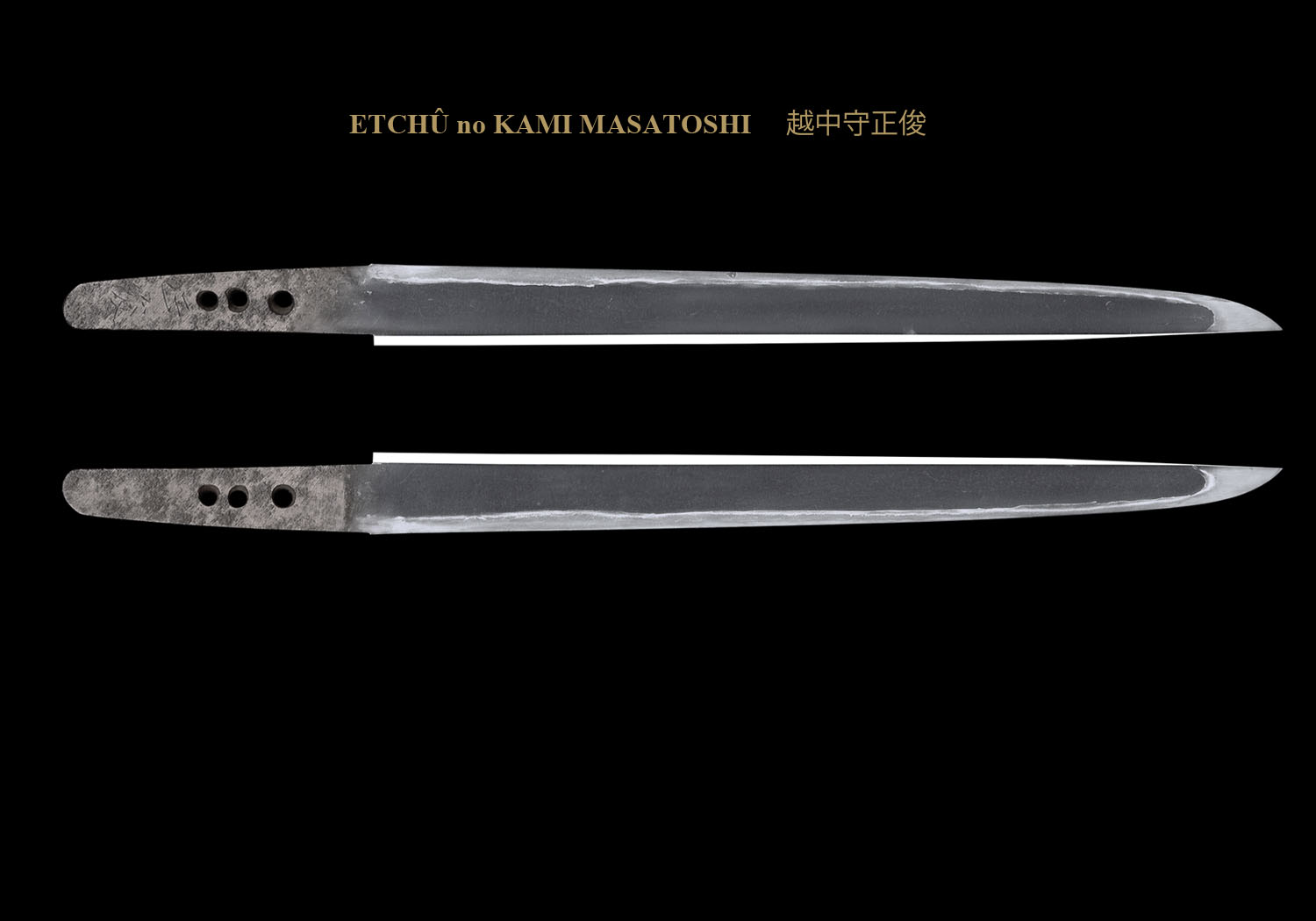 3. Late Edo: Hira zukuri tantô with a ha-watari of 24-27 cm, proportional mihaba, and shallow uchi-zori. – The Musashi 武蔵 region smiths (Masahide 正秀, Naotane 直胤, Masayoshi 正義, Tsunatoshi 綱俊, Munetsugu 宗次, Korekazu 是一, Nobuhide 信秀, and others); The Satsuma 薩摩 group (Motohira 元平, Masayuki 正幸, etc.).