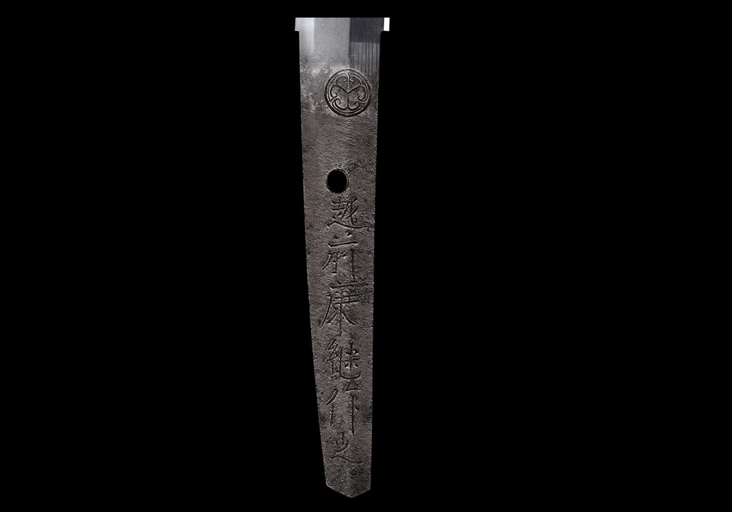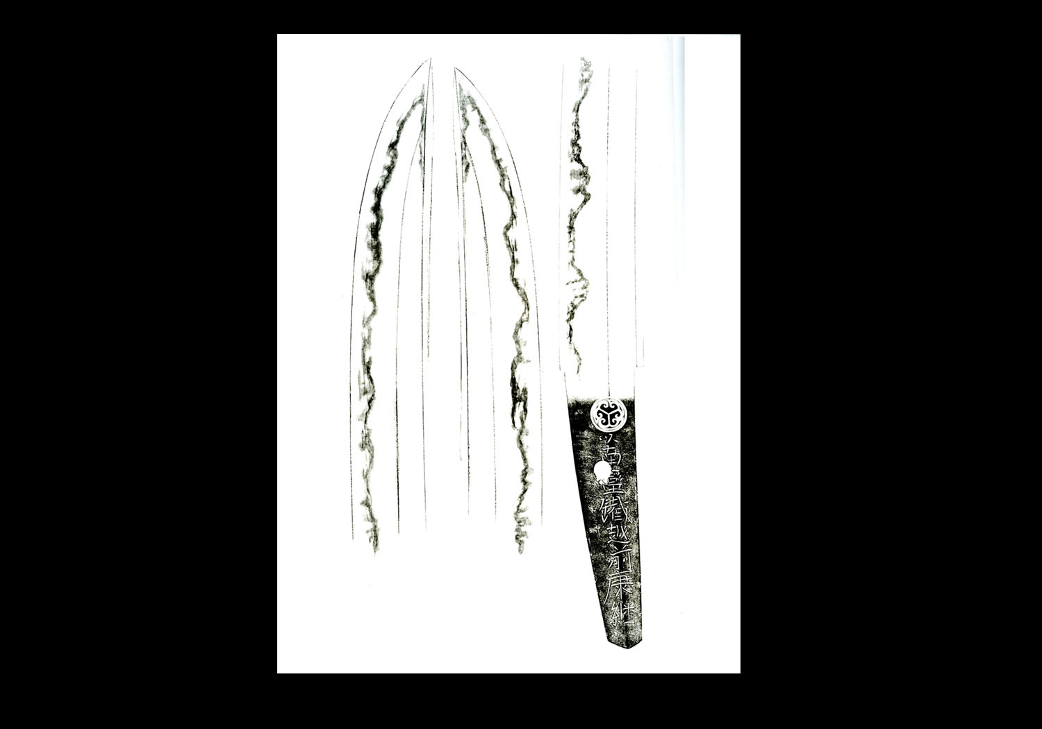 NAKAGO: Tends to be the same as the first two generations. The jiri (butt) is found in both kuri (chestnut-shape) and kengyo (v-shape). Yasurime (file marks) are katte-sagari (slightly slanting).
