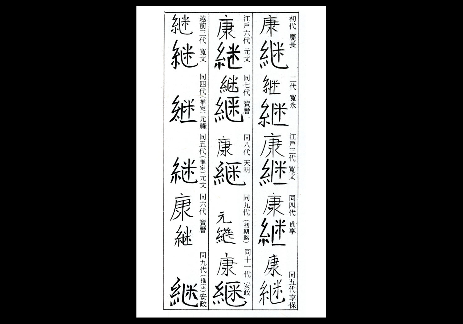 An important kantei point when determining which generation made a sword is the study of how the smith wrote “Yasutsugu”(康継). Of particular importance is the style of writing the character”Tsugu”(継). The chart below shows how the character “Tsugu”(継) was transformed by the various generations over the years.
