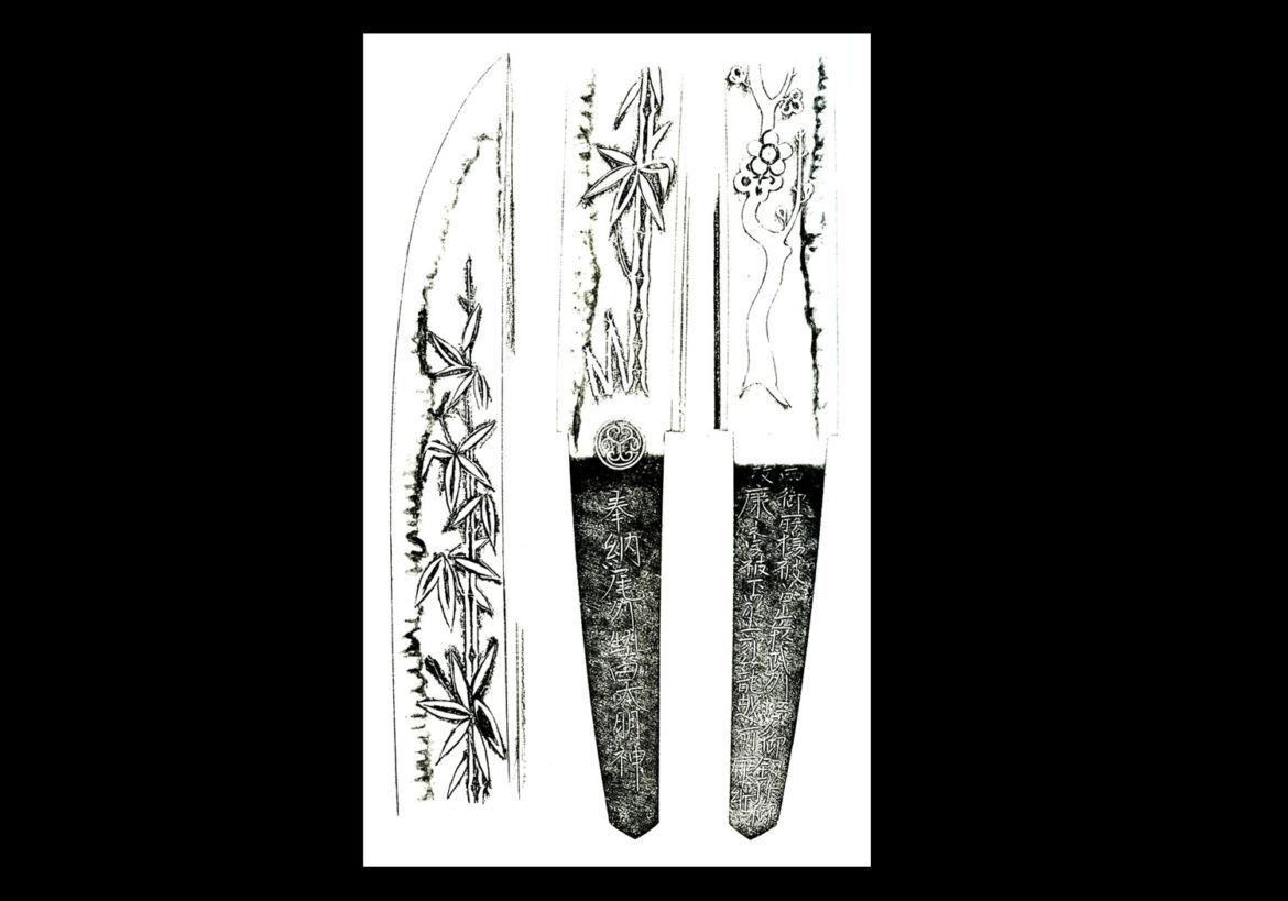HORIMONO: His swords contain the usual types such as ken, and bonji. Swords are also encountered with the engravings of plum branches and bamboo. It is generally thought that while he did some carvings by his own hand, most of the carvings on his blades were done by the famous Kinai family who were specialists in carving horimono.