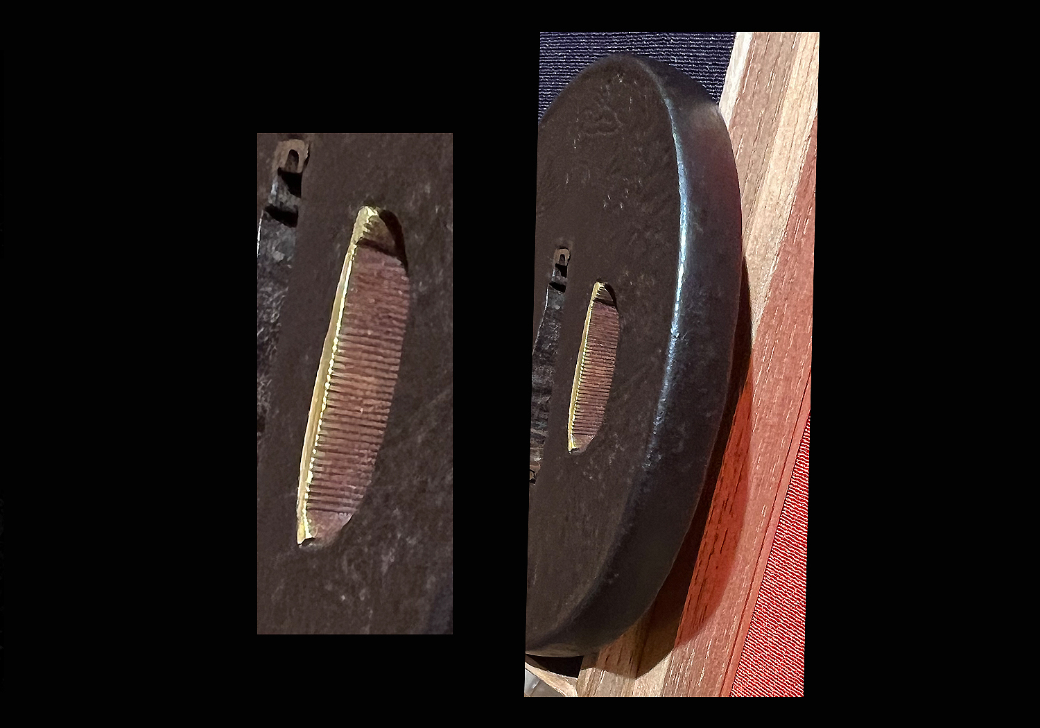 This tsuba comes in a fitted wooden box with a custom made cloth cover. It has NBTHK Tokubetsu Hozon papers which attest to the validity of the signature and the quality and rarity of the work.