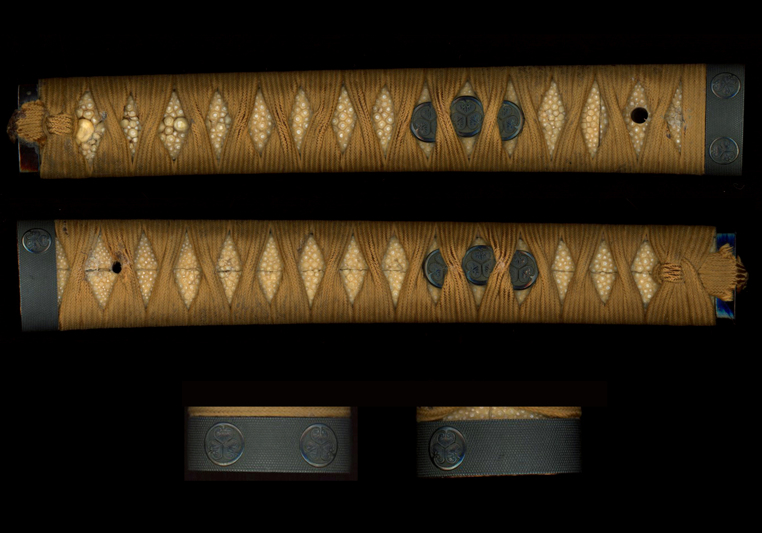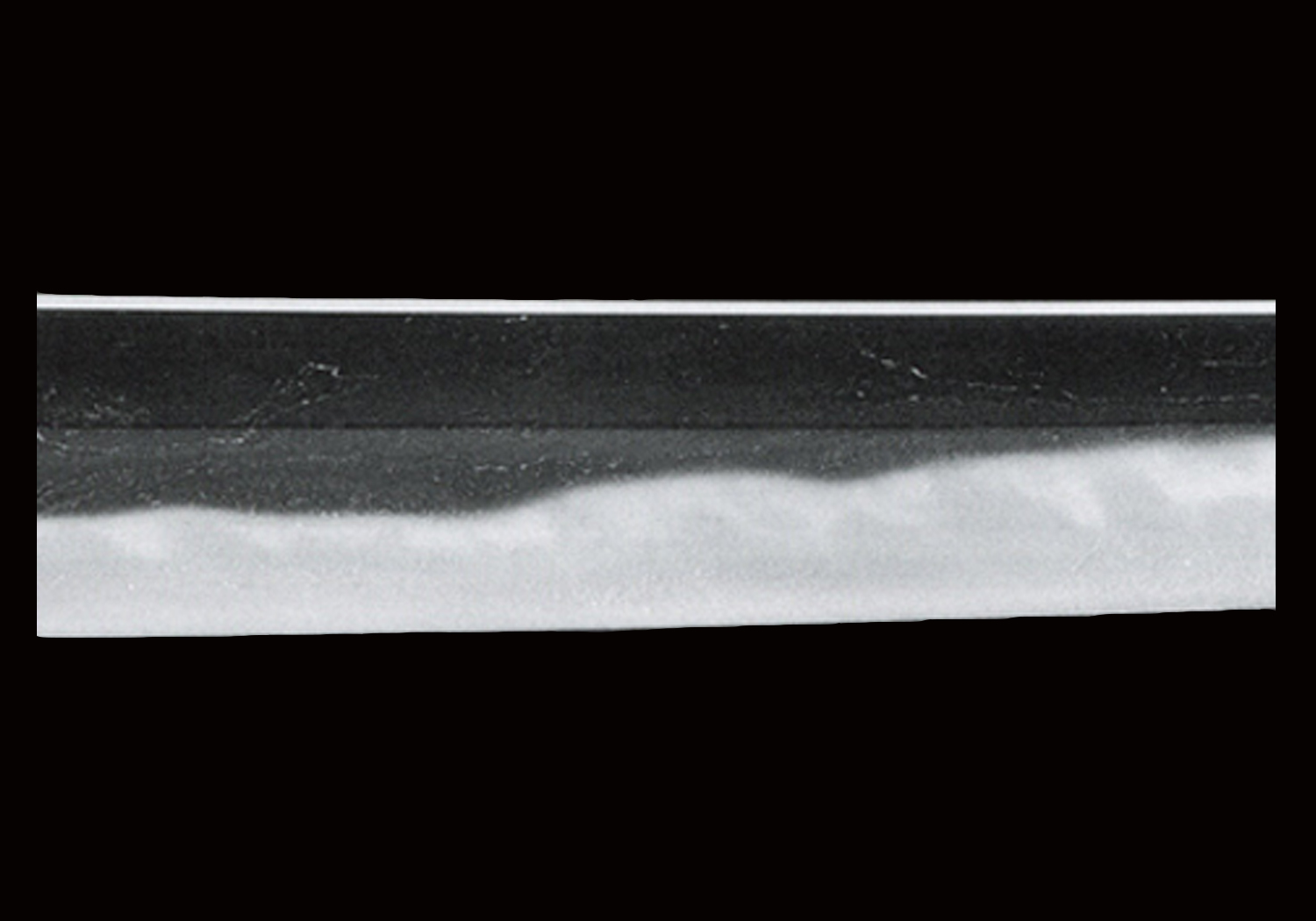 This tachi features a prominent midare-utsuri and is hardened in a chōji-midare that is mixed with gunome and ko-gunome. The ha widens and shows more ups and downs along the monouchi of the haki-omote side, appearing so in a flamboyant manner in this area. The ha is nioi-based, but does feature plenty of fine ko-nie. Thus, we recognize in the interpretation of the jiba the characteristic features of Yoshihira. It is noteworthy that the ha tends to slant on both sides from the mid-blade section downwards. This is not seen on any other existing works of Yoshihira, which makes this blade an important reference for understanding the workmanship of this smith. Despite being suriage, the blade retains a prominent koshizori, displaying so with the wide mihaba a powerful tachi-sugata. Both ji and ha are perfectly healthy (kenzen) and truly reflect the outstanding skill of Yoshihira.