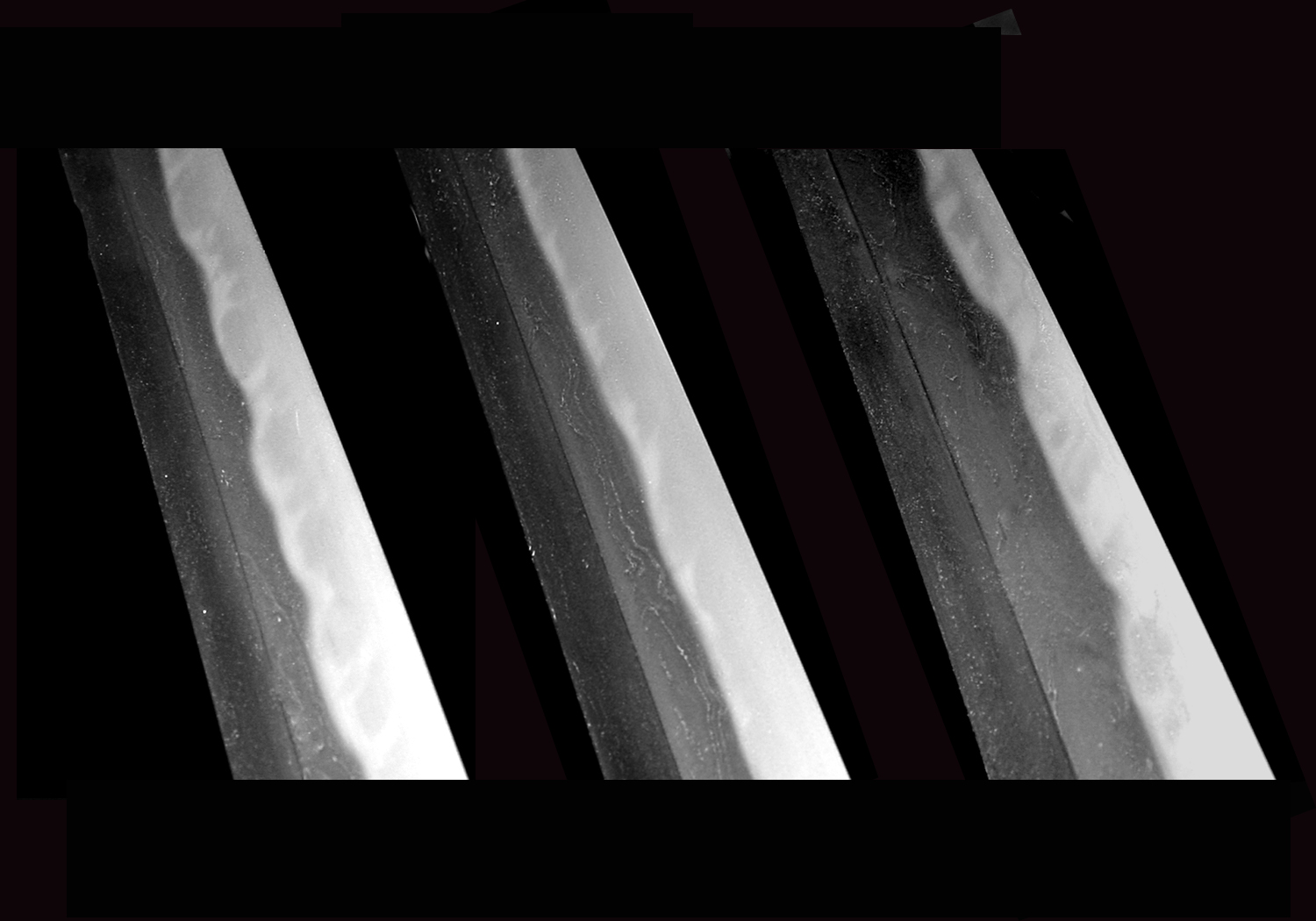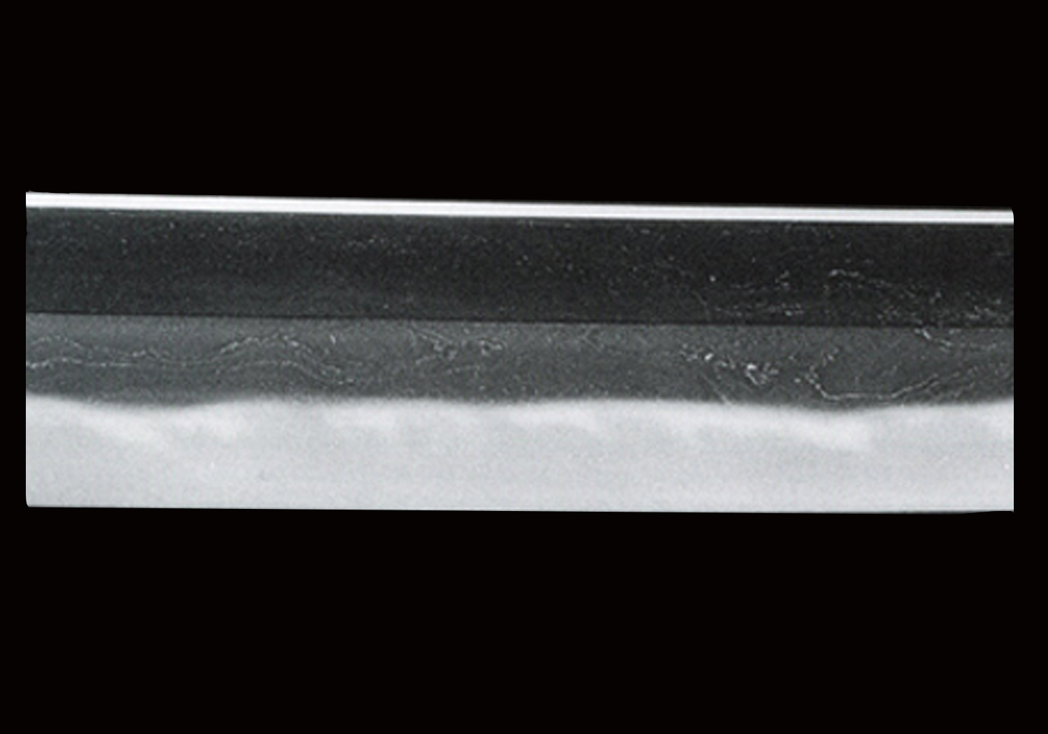 The kitae is mainly tight itame-hada mixed with mokume-hada. Occasionally a slight amount of o-hada or loose-grained area will be present. There will be pronounced utsuri in the form of choji-utsuri, midare-utsuri, jifu-utsuri or botan-utsuri.