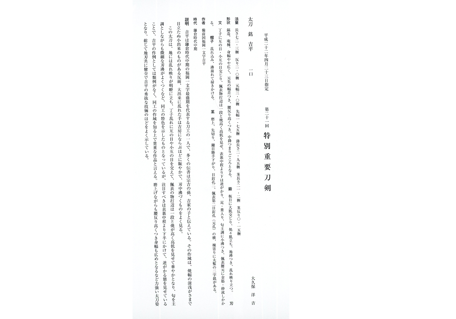 The translation of the Tokubetsu Jûyô Tôken setsumei is as follows: