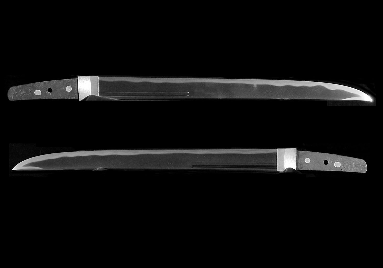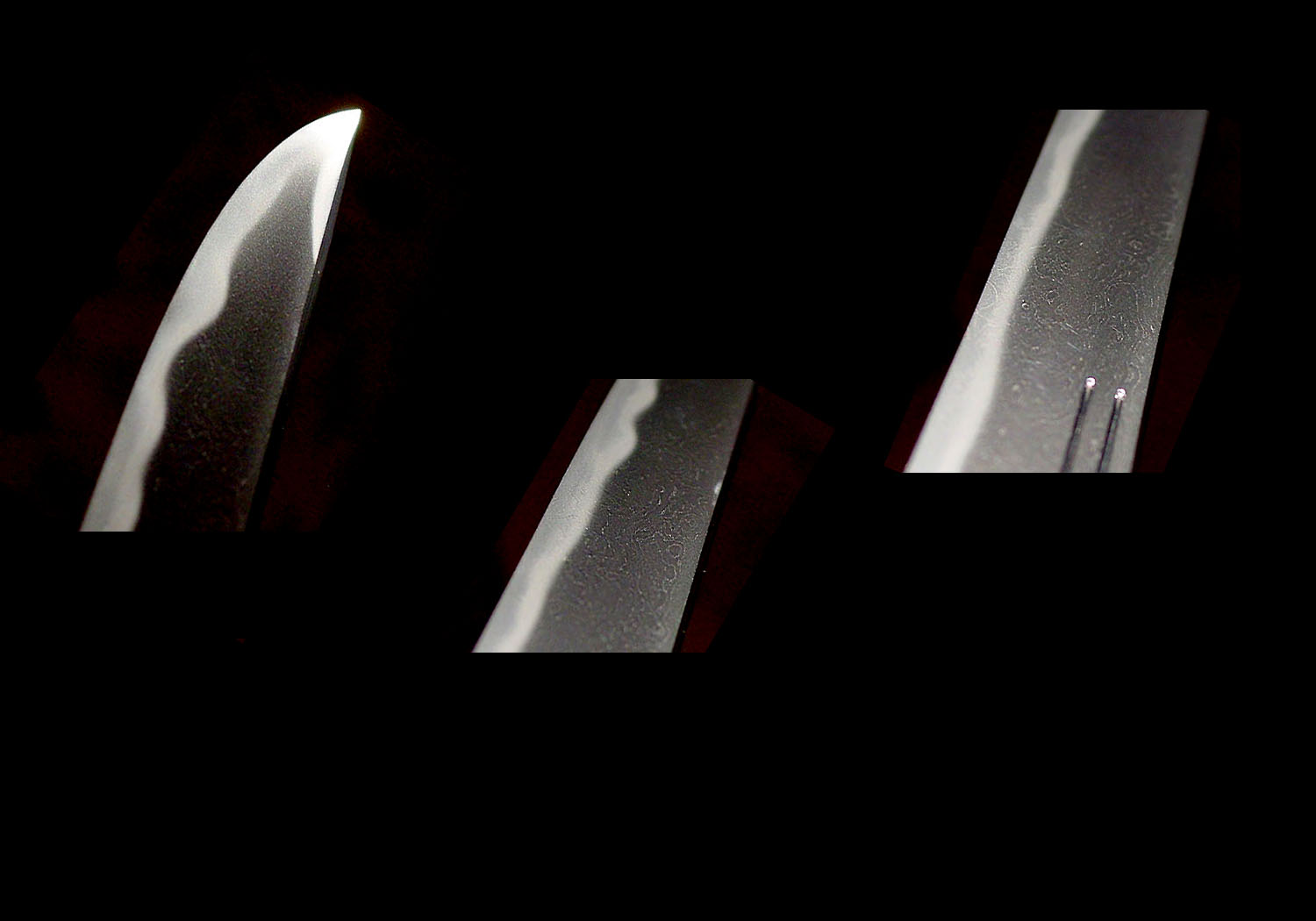 The construction is hira-zukuri with an iori-mune. The blade is somewhat wide, and in comparison, to the width, the blade is long. The blade is thin, and the curvature is shallow. The kitae is itame-hada mixed with mokume that is covered in minute ji-nie. The jigane contains abundant chikei and faint utsuri. The hamon is shallow notare based with ko-notare and a mixing in of ko-gunome. There is ko-ashi activity, and the nioiguchi is somewhat thick. The habuchi is well covered in ko-nie, and there is kinsuji activity with streaks of sunagashi. The boshi is notare-komi with a ko-maru and somewhat long kaeri. From the base of the koshi on the omote, there is a gomabashi carving that extents onto the nakago, and on the ura there is a carving of a koshi-bi with a soe-bi that similarly taper off onto the nakago. The nakago is ubu, and the tip is an extremely shallow ha-agari-kurijiri. The yasuri are sujikai, and there are three mekugi-ana, of which two are filled. Running down the center of the sashi-omote is a long signature that is interrupted here and there by the second and third mekugi-ana. There is a date similarly placed on the ura.